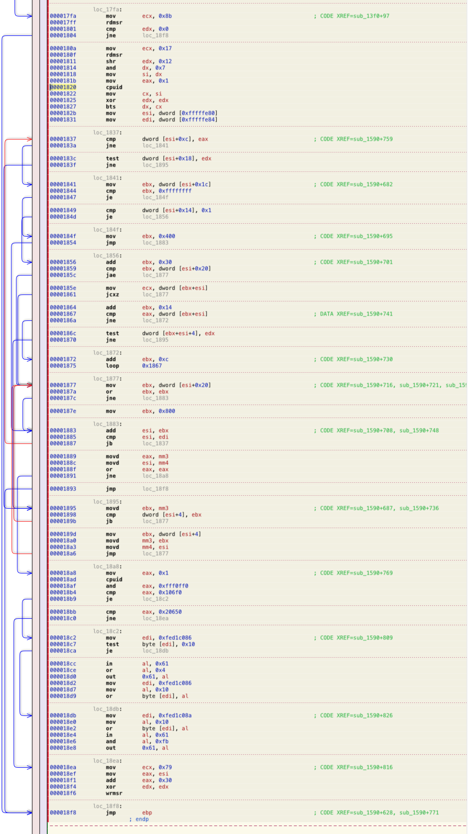 CPUID into the EAX registers and scans the section of memory containing the microcodes for a match. If it finds a match, it does another check to see if the CPU is an Arrandale (0x20650), or an "Auburndale" (0x106F0). If so, it does some additional processing.