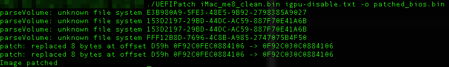Maybe something wrong with your bios dump ? This is usage and expected output:Hi @m0bil, I tried to implement the disable Igpu patch, but got the following error "function called with invalid parameter" as shown in the picture. Can you please help to point me in the right direction on the command? Thanks.