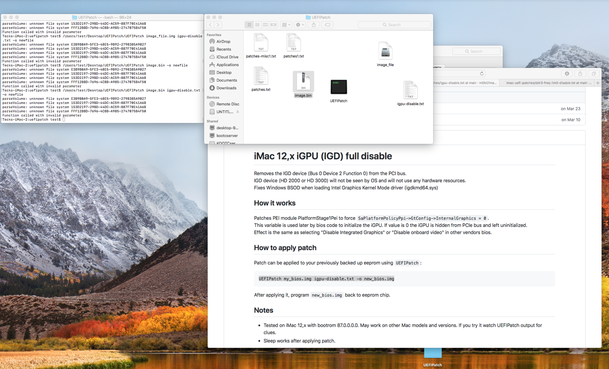 - Tested on iMac 12,x with bootrom 87.0.0.0.0. May work on other Mac models and versions. If you try it watch UEFIPatch output for clues.