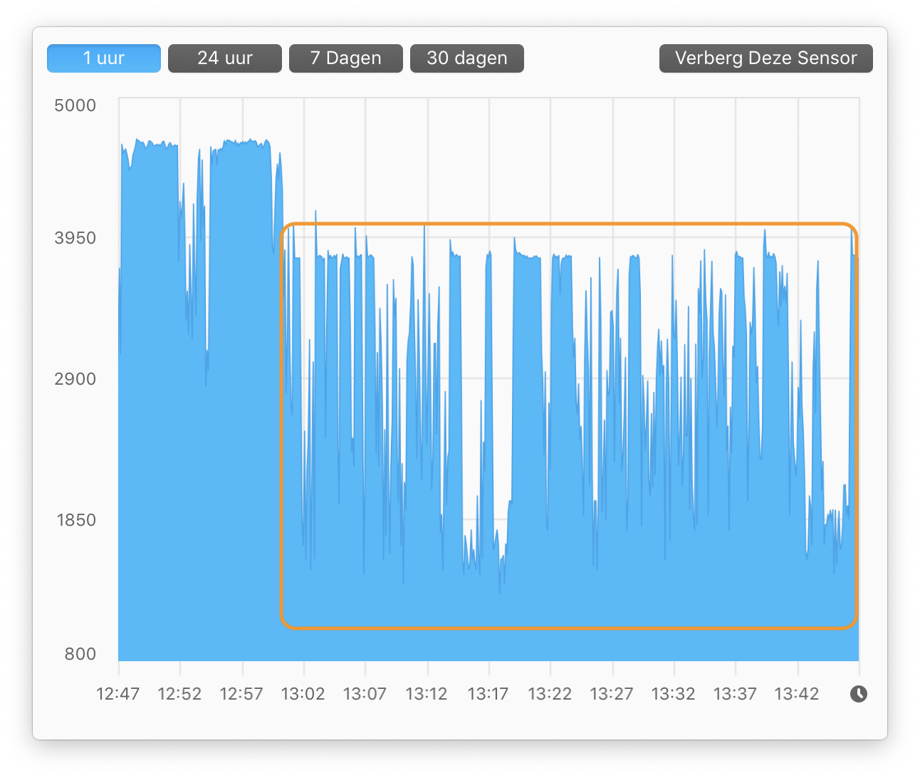 2. monitoring this day > Els is rendering, but also working on photo editing. Then you see whole different story: the iMac is continuously struggling to maintain maximum clock speed. Not thermal throttling i guess, but just the fact other programs are asking continuously also attention and CPU speed. Hard to say what the effect is, but on average the clock speed slows down to the area of 2,6Ghz... So maybe this is perfectly normal, because we never actually did the same monitoring and testing on the mac pro, but i wished i just saw the same performance like when rendering is the only thing the mac is doing; (that is what you see from 12:47hr until 13hr - then Els very quickly eat something...) (the orange square)
