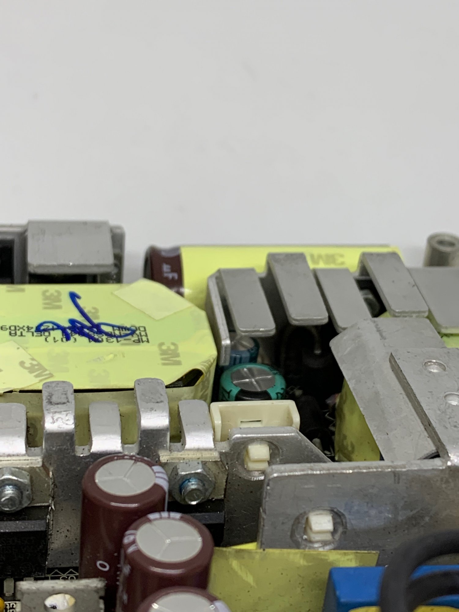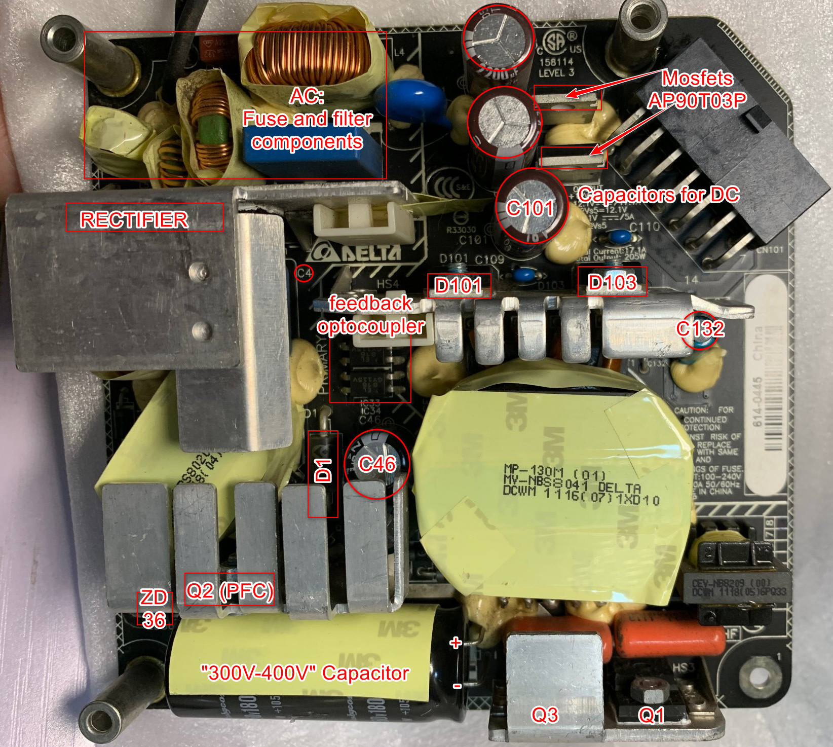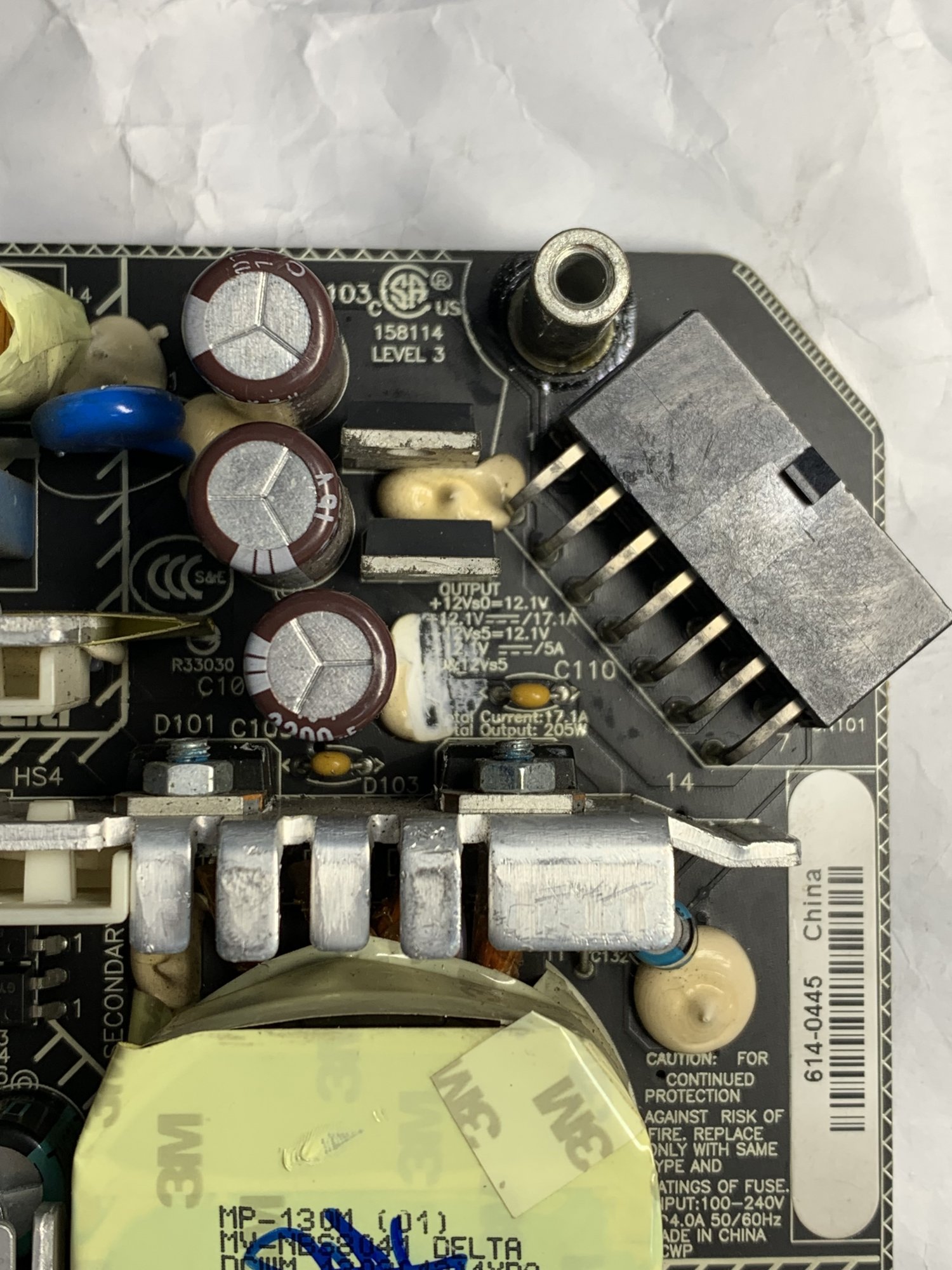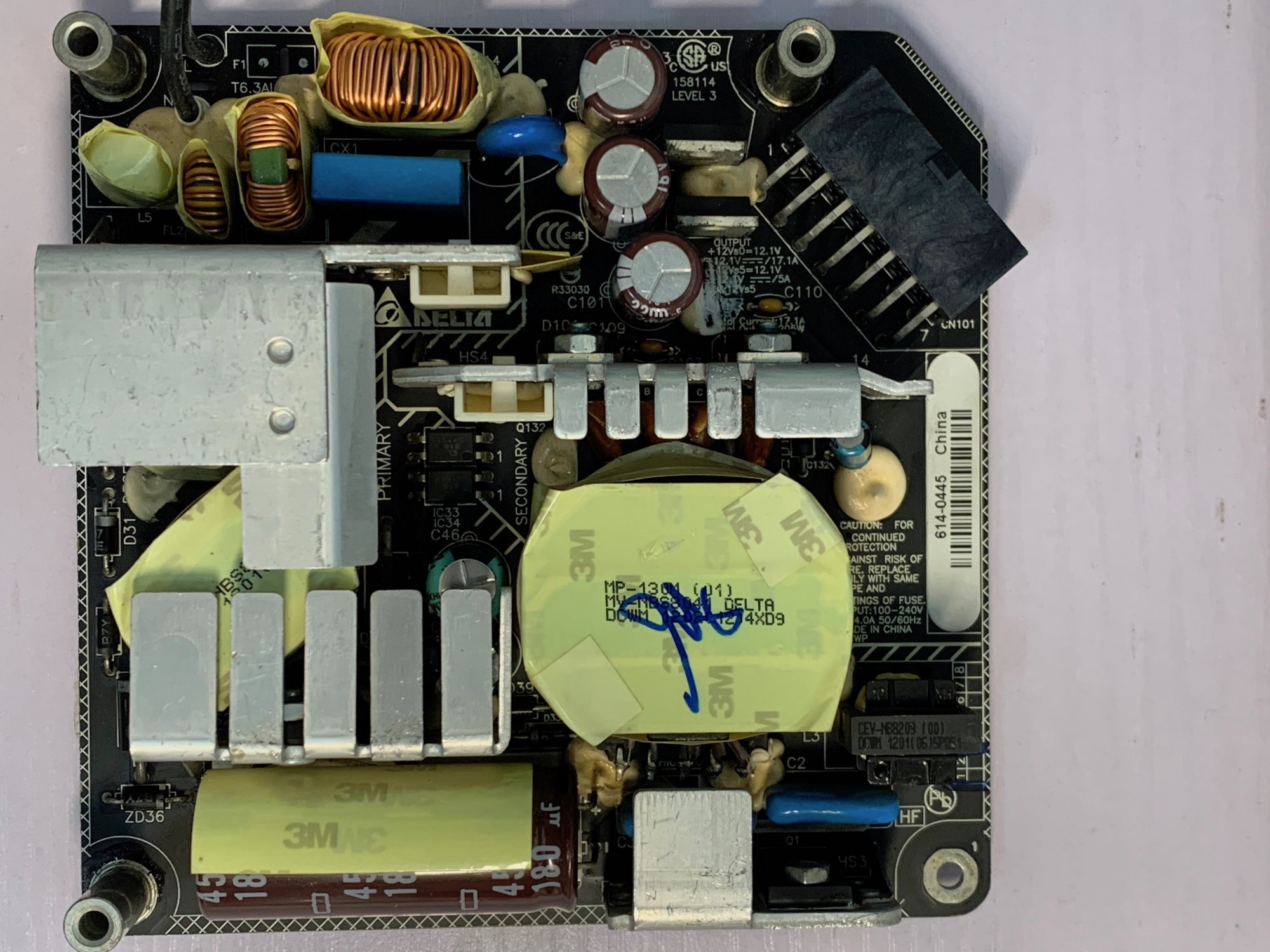 I was stupid enough to accidentally touched the PSU [ACBEL Model OT8043 PSU. (Apple P/N: 614-0444)] with the CPU heatsink during a logic board removal for an iMac 21.5 2010 and heard a pop sound with some sparks and is now dead [PSU was plugged into the logic board during removal and logic board is still fine when tested in a different machine]