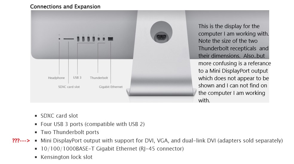 The 21.5 Late 2013 IMac has two Thunderbolt ports, both being Small square dimensions. I have tried both a mini display port and a USB-C cable, following direction of documentation supposedly for this computer but apparently for the 27 inch system. The plugs of the cables I tried are too large and are not square