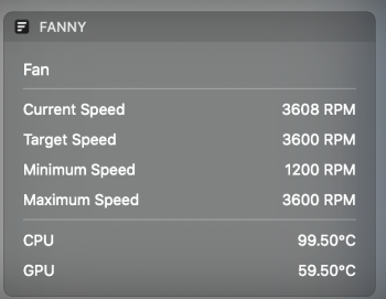 I installed Fanny Fan widget and when under load (converting 1080p video) then fans and CPU temp went up to 3600 RMP, CPU 90/102c GUP 58c