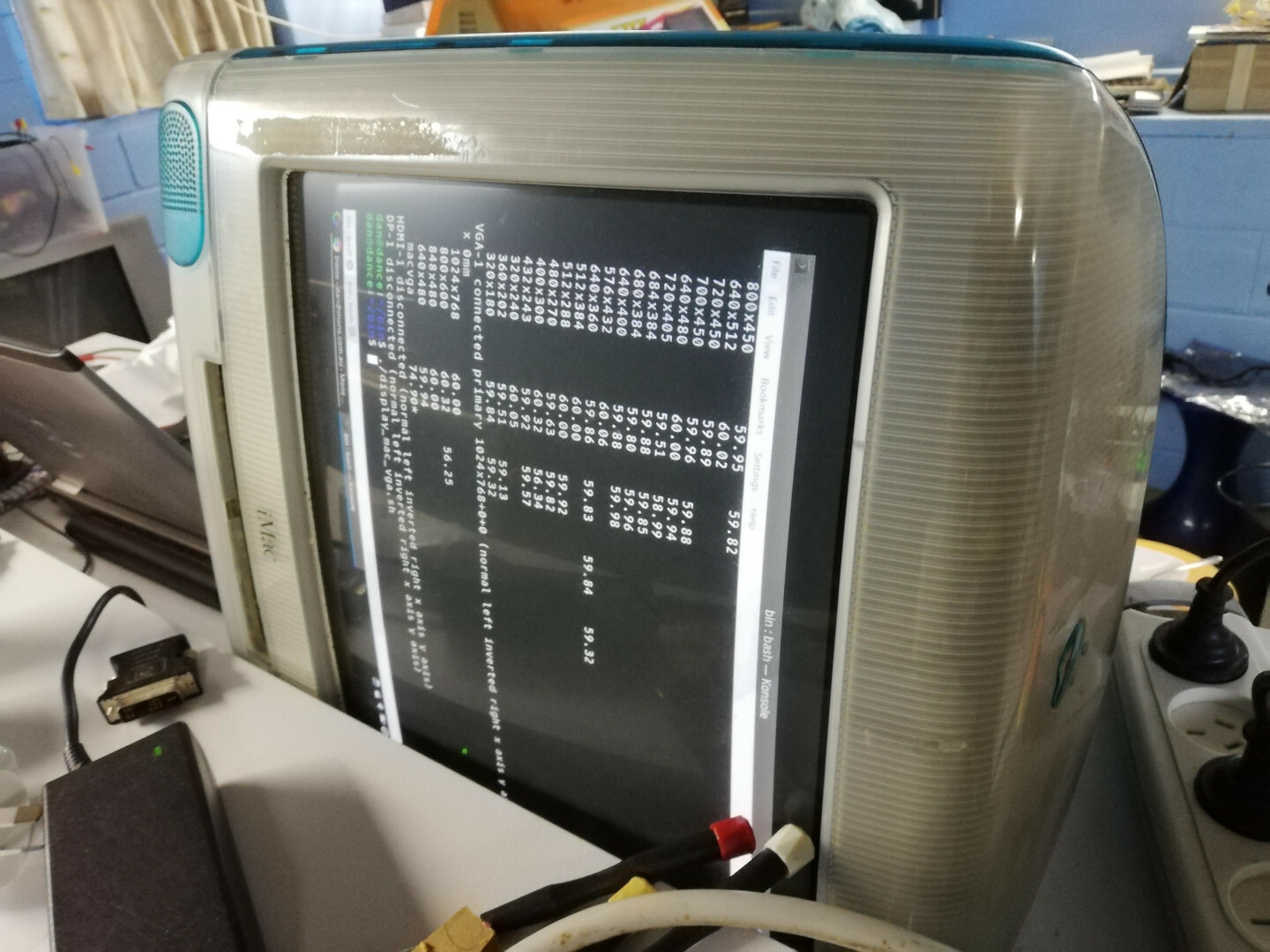 I made myself a connector to convert from the DE15 VGA connection on my laptop to the DB15 connected on my iMac, fed a 1024x768@75Hz mode to the screen via the DB15 RGB cable, and with the logic board plugged in (custom ATX connector and "audio" header that includes connections to the power button), I get a picture. Wonderful!
