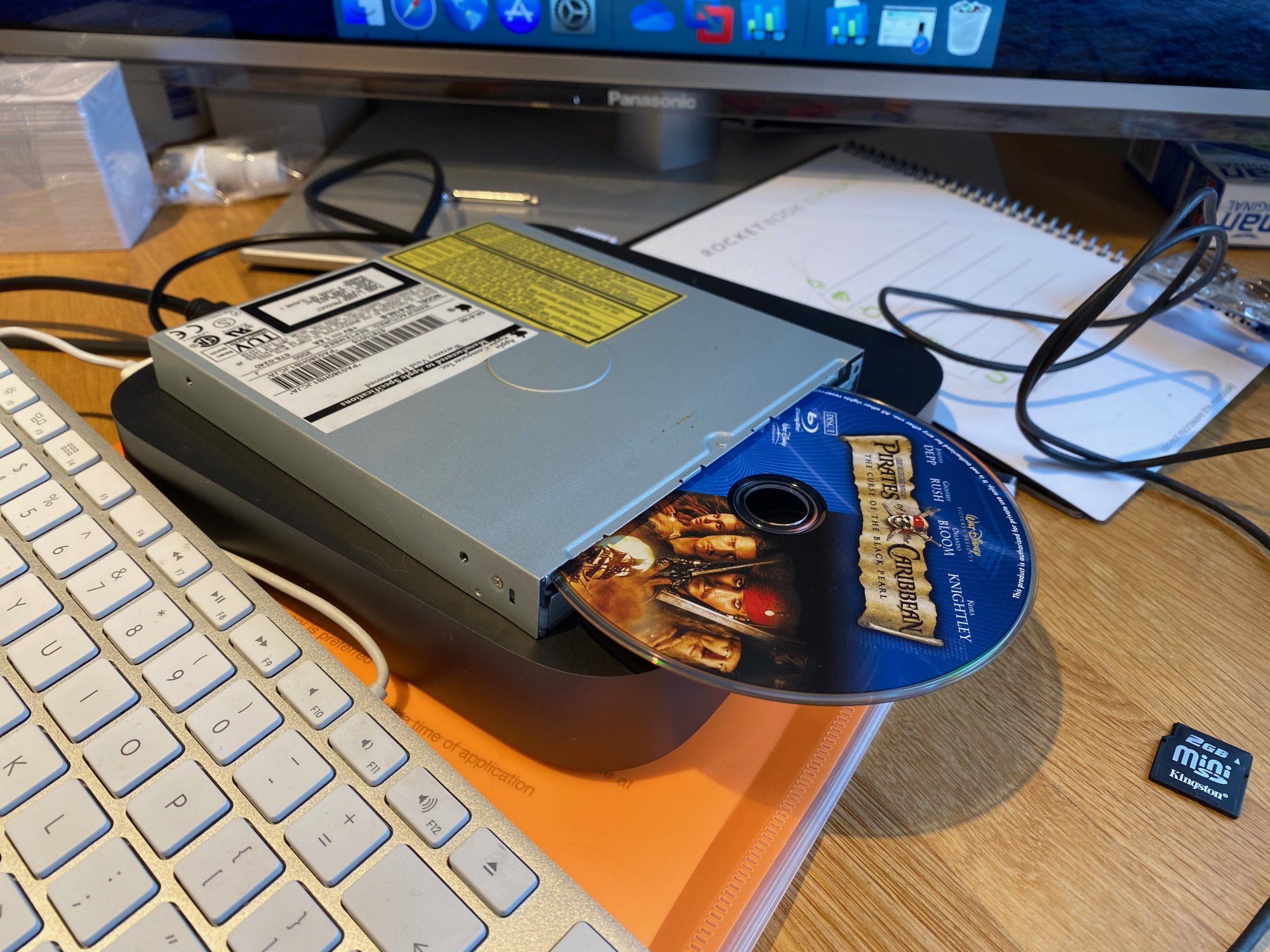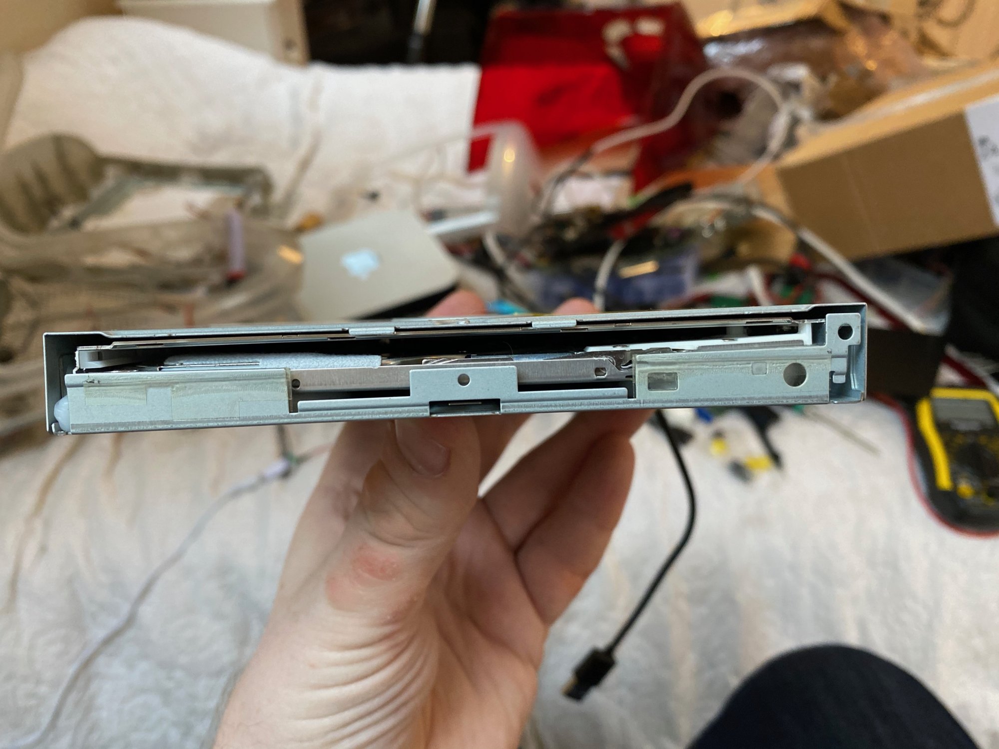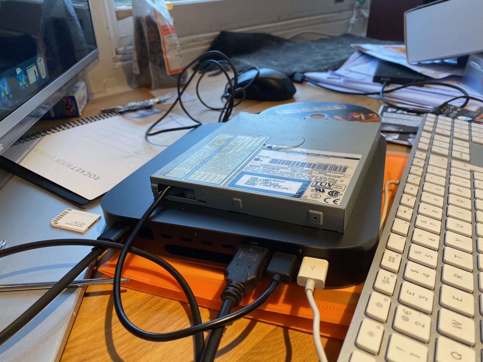 It's just a standard blu-ray SATA slot loader drive. I got a cheap external USB case for optical drives (actually one meant for tray mounting as it was easier and cheaper to source) and I popped that open and removed the SATA->USB adapter. That's then plugged into the drive and routed out through the existing hole at the back of the iMac drive's case.