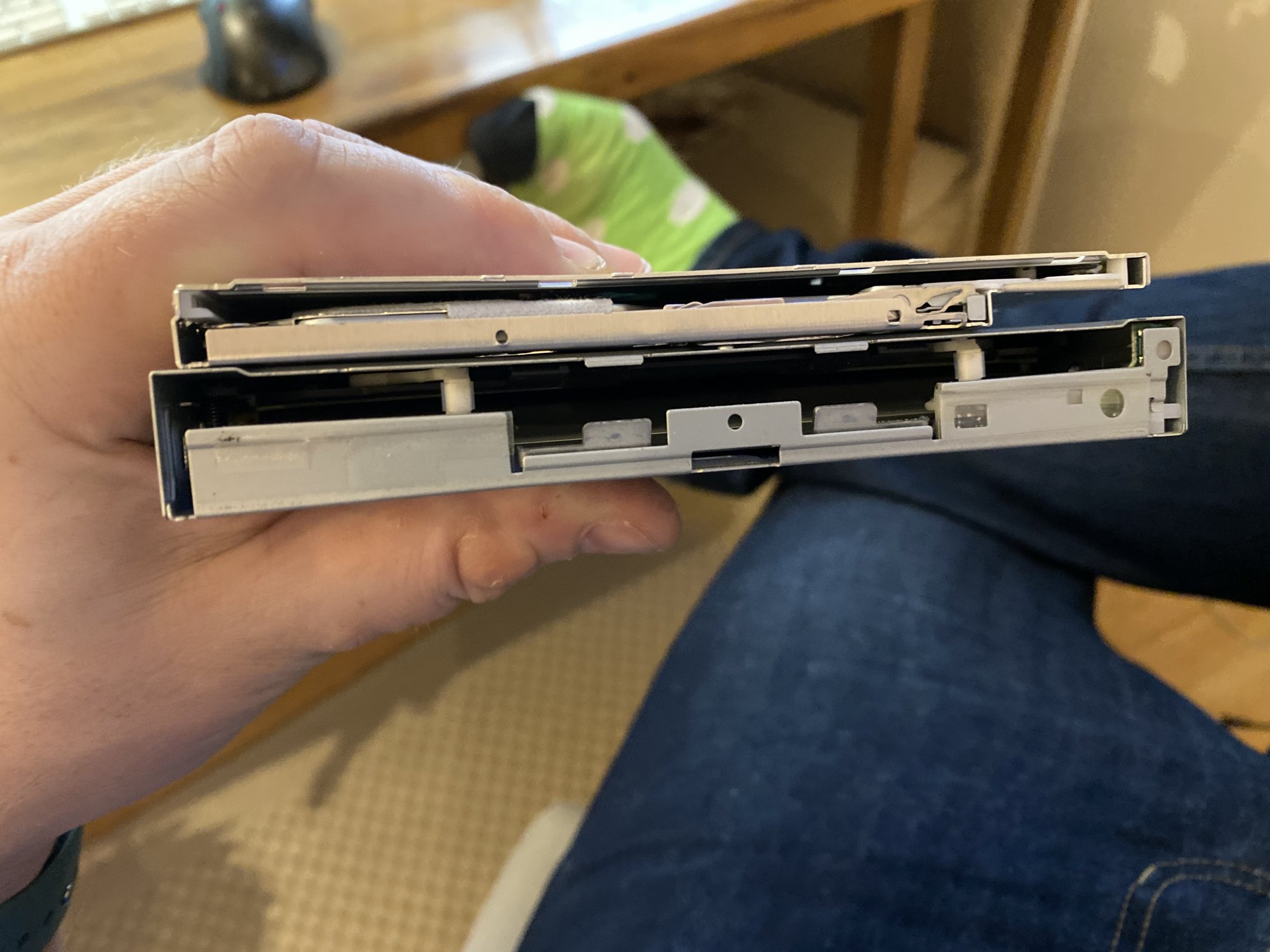 I then opened the iMac drive up and removed the guts. There are two tiny screws on the outside of the drive that you'll want to keep - the lid of the drive opens up like a car bonnet with them taken out (pull the edges at the front slightly to allow it to swing up). Everything inside, you can throw out. There is one raised bump near the front of the inside of the case that I needed to flatten. I used a hammer to bash it down but I'd advise against doing that and instead, just dremmeling it out in place. When you hammer it, it doesn't make it go flat, it just makes it go down so you end up with a bit of a bump on the underside. It should be fine for my purposes though anyway.