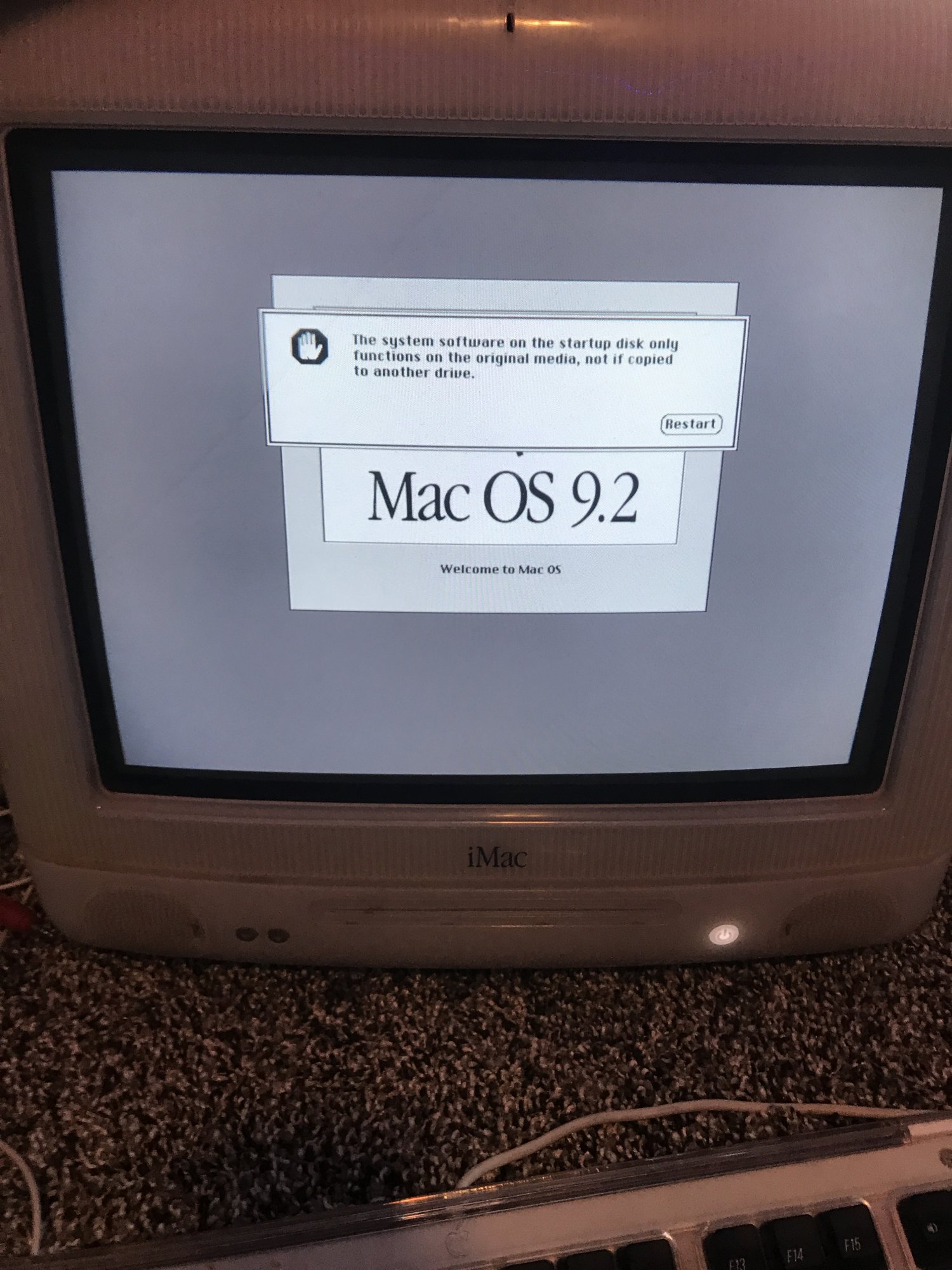 So I have an iMac G3 That I Was tinkering around with and happened to find a Mac OS 9.2 system folder. I tried to boot it but I got stuck on an error message saying “The system software on the startup disk only functions on original media, not if copied to another drive.” And I was loosing hope to get it back on its 10.4 partition. Any Help?