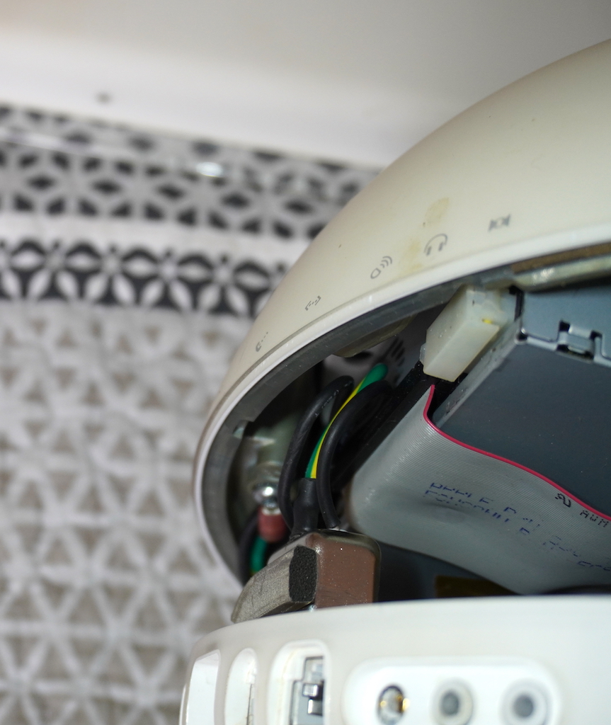 Continue to lower the base slightly. Note the vertical positioning of the earth wire (with red ident), also how the green/yellow & black wire bundle and connector slides out easily from the space between optical drive ribbon cable and inner surface of dome. If yours doesn't look exactly like this it's probably the problem area.
