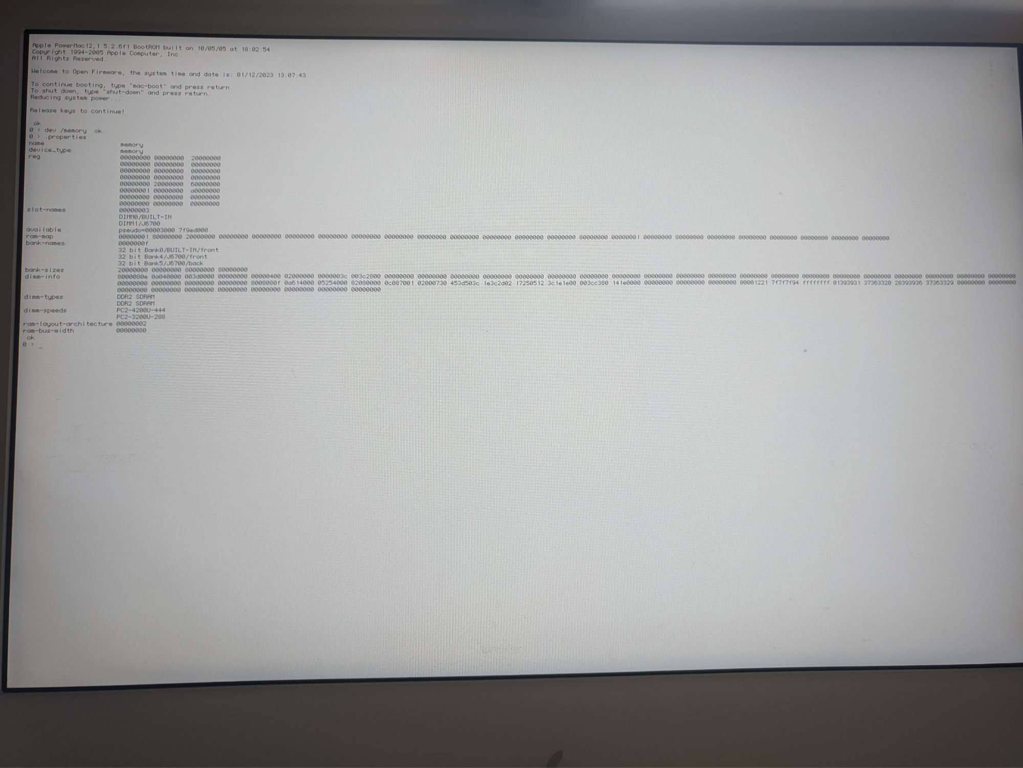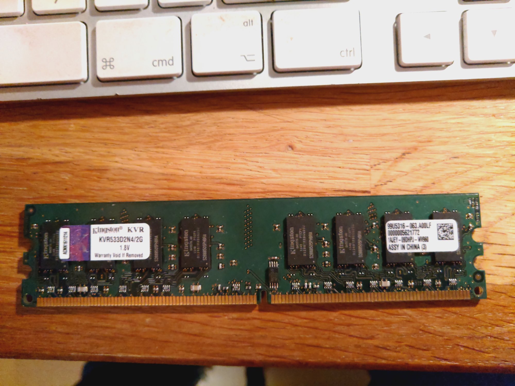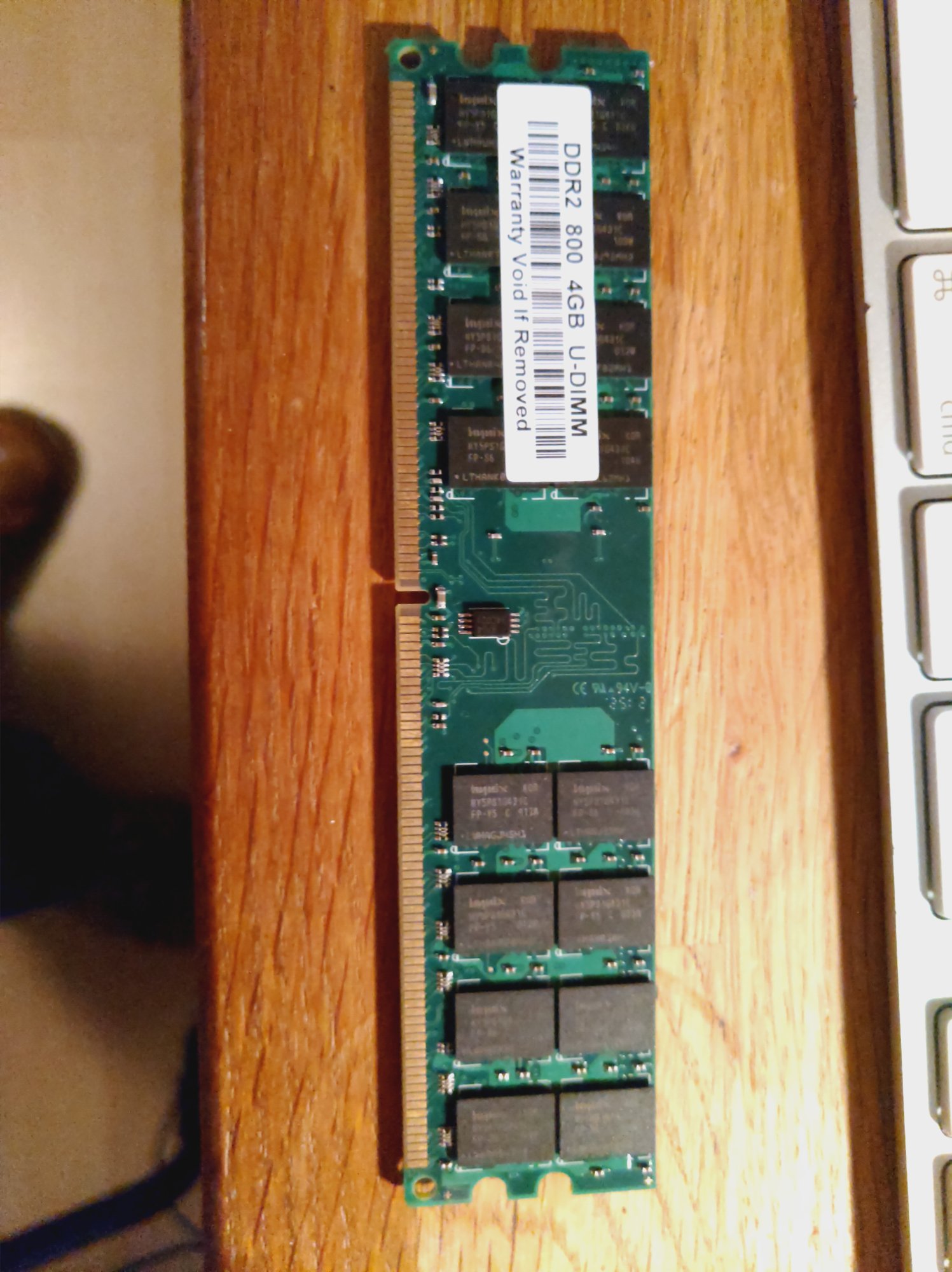 So this iMac apparently has a bit in common with the late 2005 PowerMacs; PCIe based graphics, and DDR2 memory. Since it only had 1.5GB I immediately wanted to upgrade to the "max" of 2.5GB. I grabbed one of my RAM bags, and sifting through it I found multiple 4GB DDR2 sticks. Since the G5 architecture is obviously able to address over 2GB unlike G4s, I decided to put it in and see what happens.