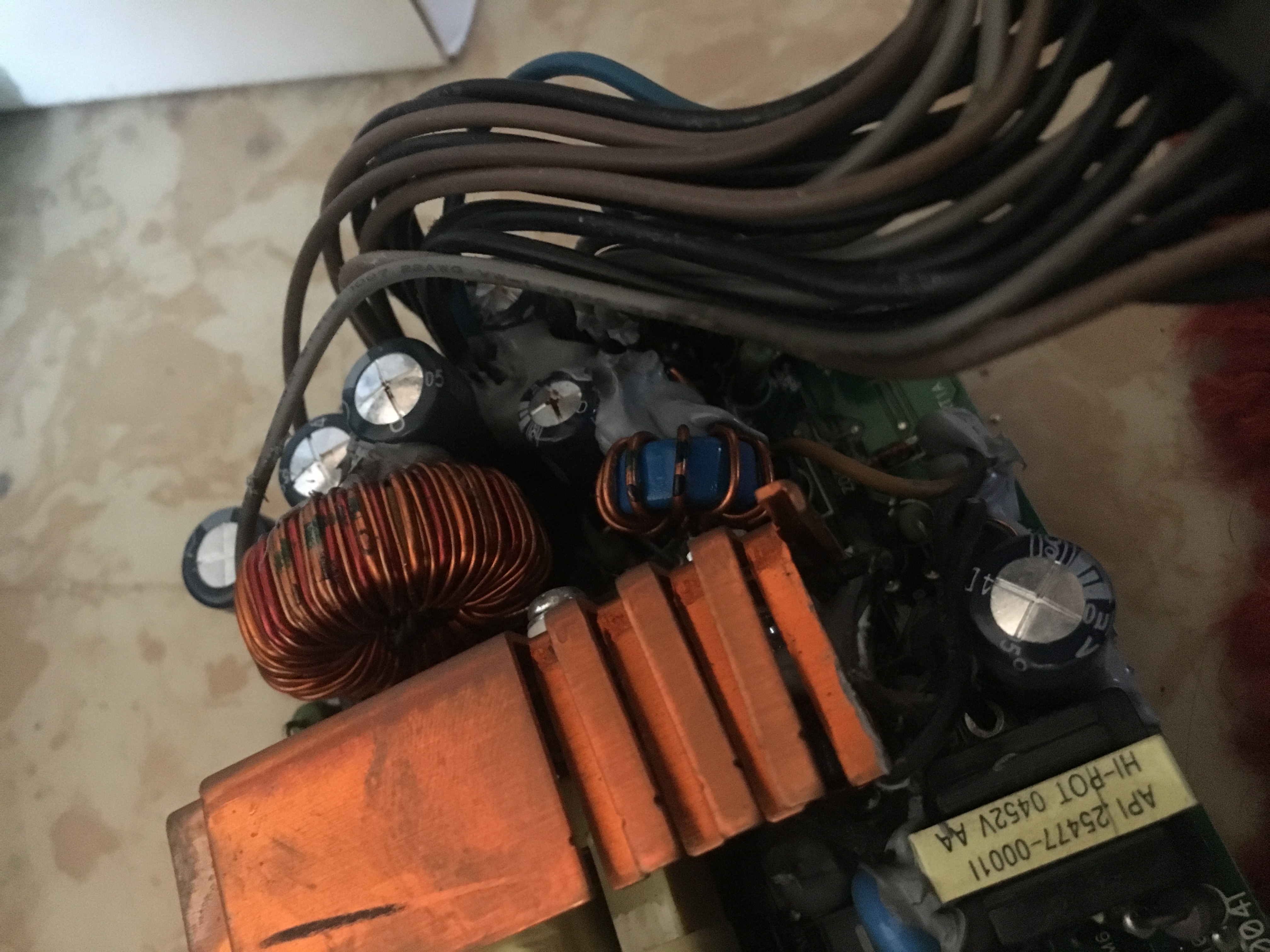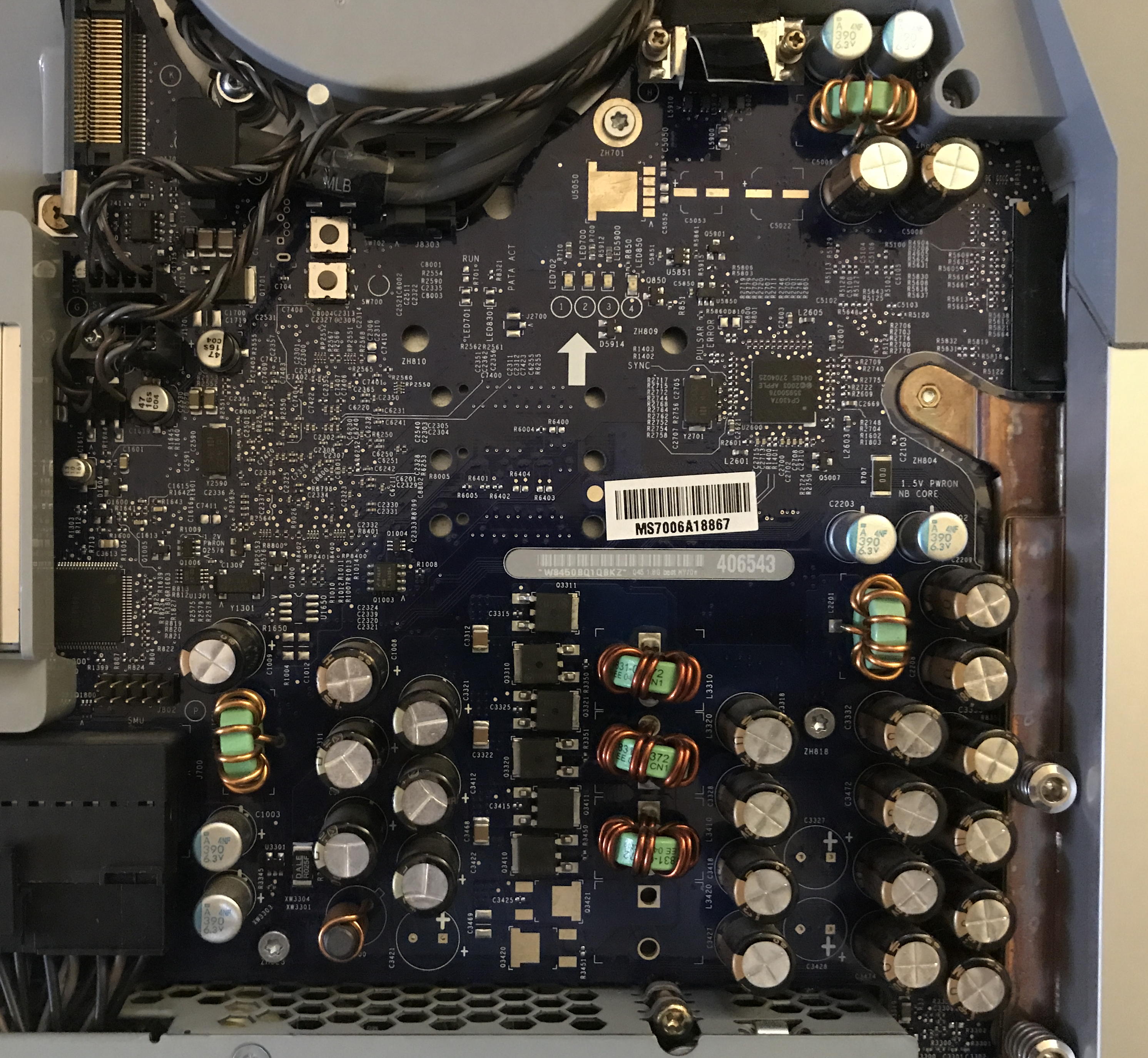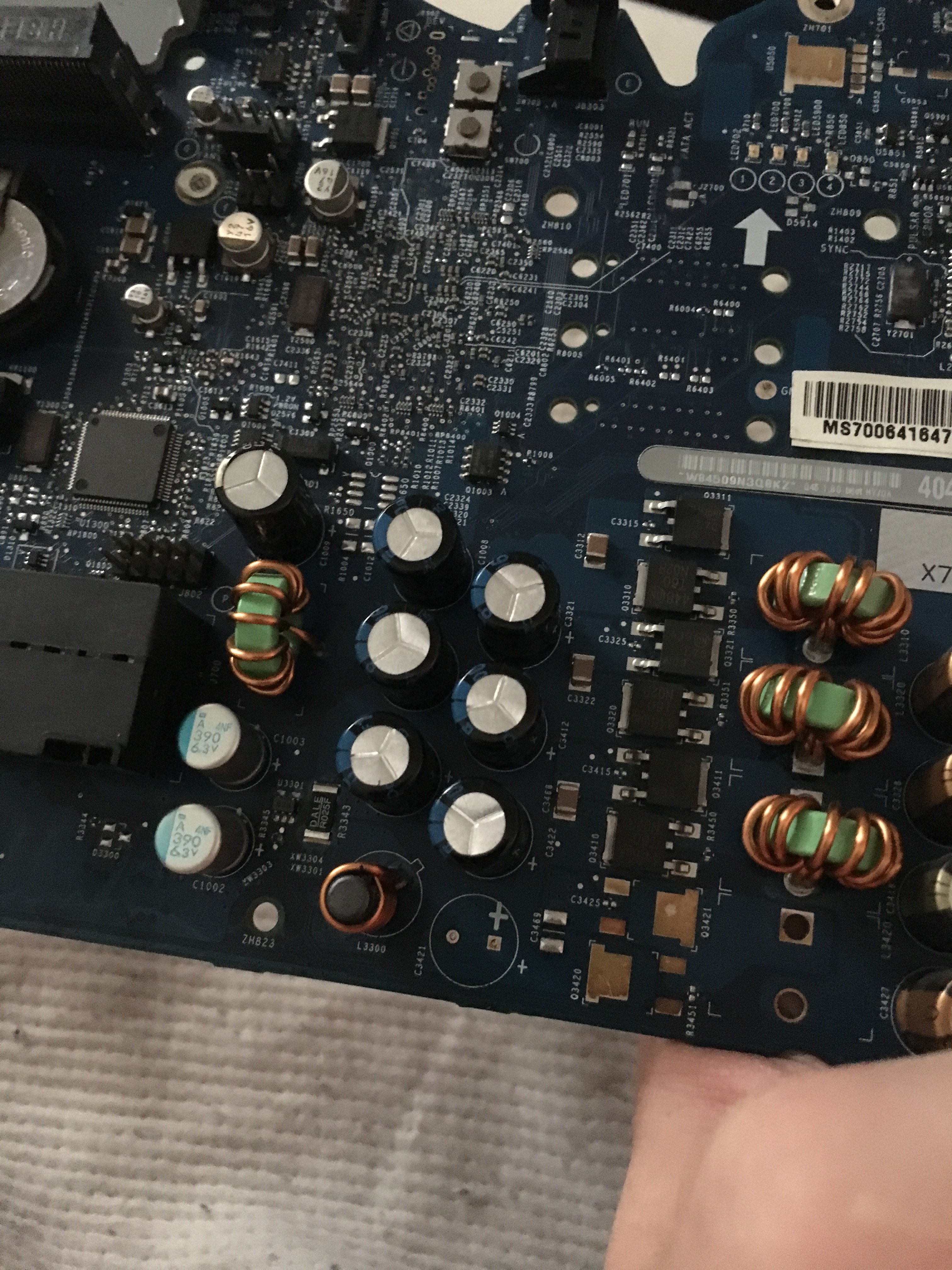 Hi folks! I finally got something with a G5(I know i wanted a PMG5 Quad, I am still searching for one). Its a iMac G5 this one https://everymac.com/systems/apple/imac/specs/imac_g5_1.8_20.html with 2 gigs of ram installed. The thing is it was for sale as "for parts/repair". When I try to turn it on the light in the down right corner lights up and just the diagnostic LED 1 and 2 are lit up. No backlight, no fans, no sound, no nothing... First thing I noticed are the caps on the boards. Any other idea?