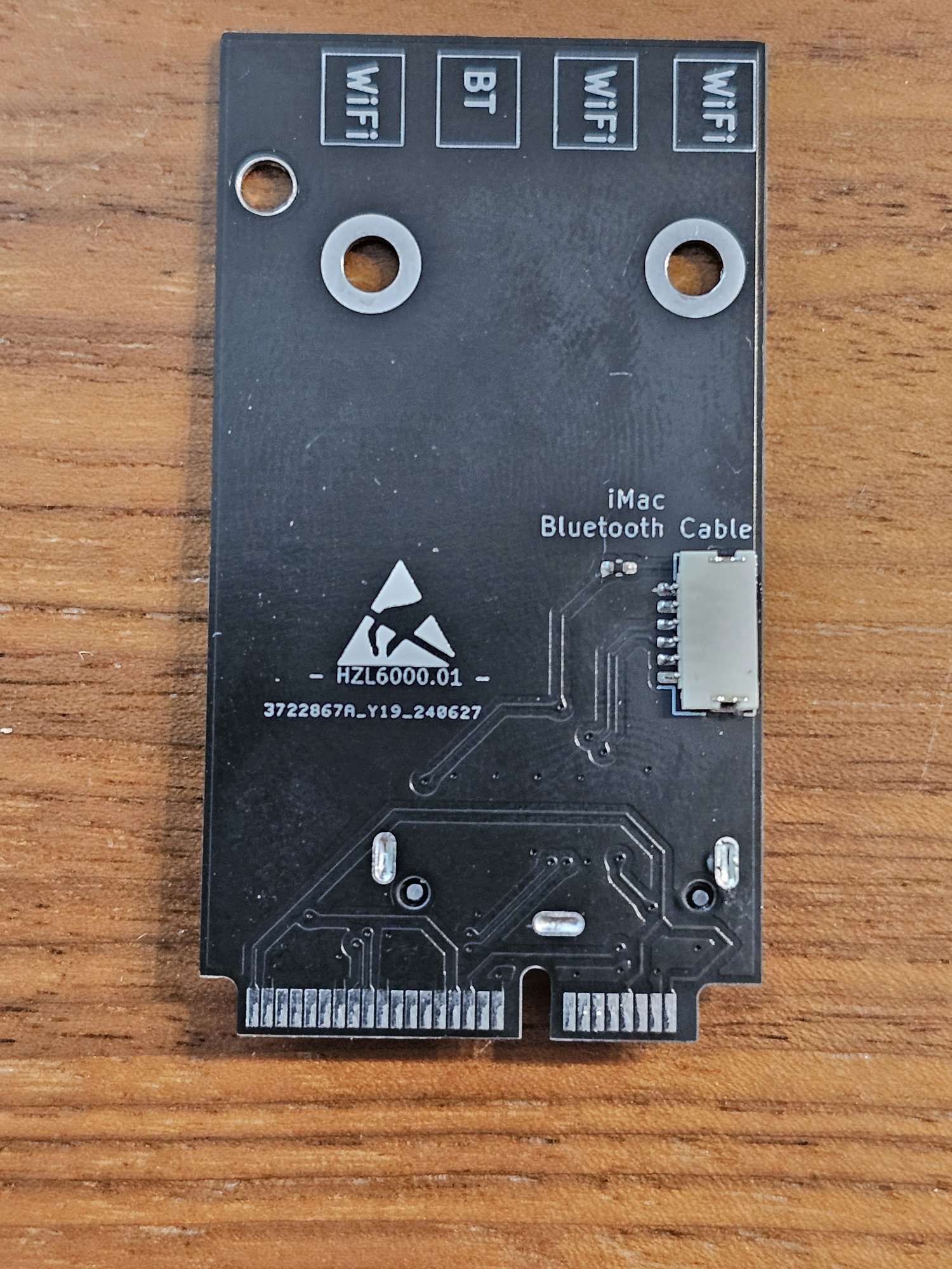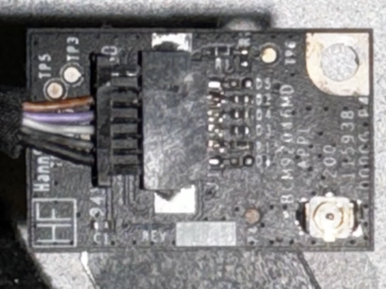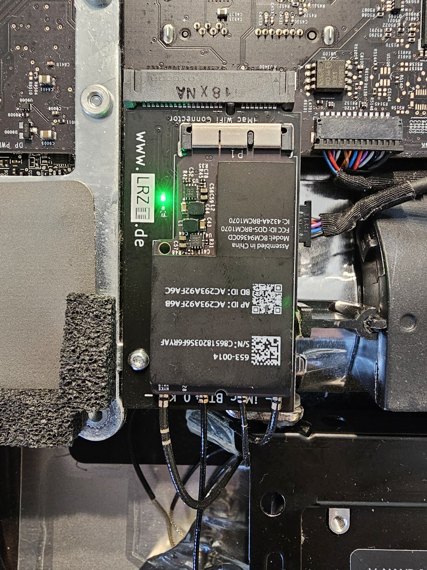 I plugged the WiFi cables into the new WiFi card, then the BT extension cable. Then I screwed the WiFi card to the adapter. This also prevents the cables from coming loose. Then screw on the adapter in place of the old WiFi card. Fits perfectly. I removed the old Bluetooth module and pulled the cable back to the new WiFi card. Simply plug it into the connector there. Now plug the BT extension cable into the BT cable wich was onthe old BT module and you're done