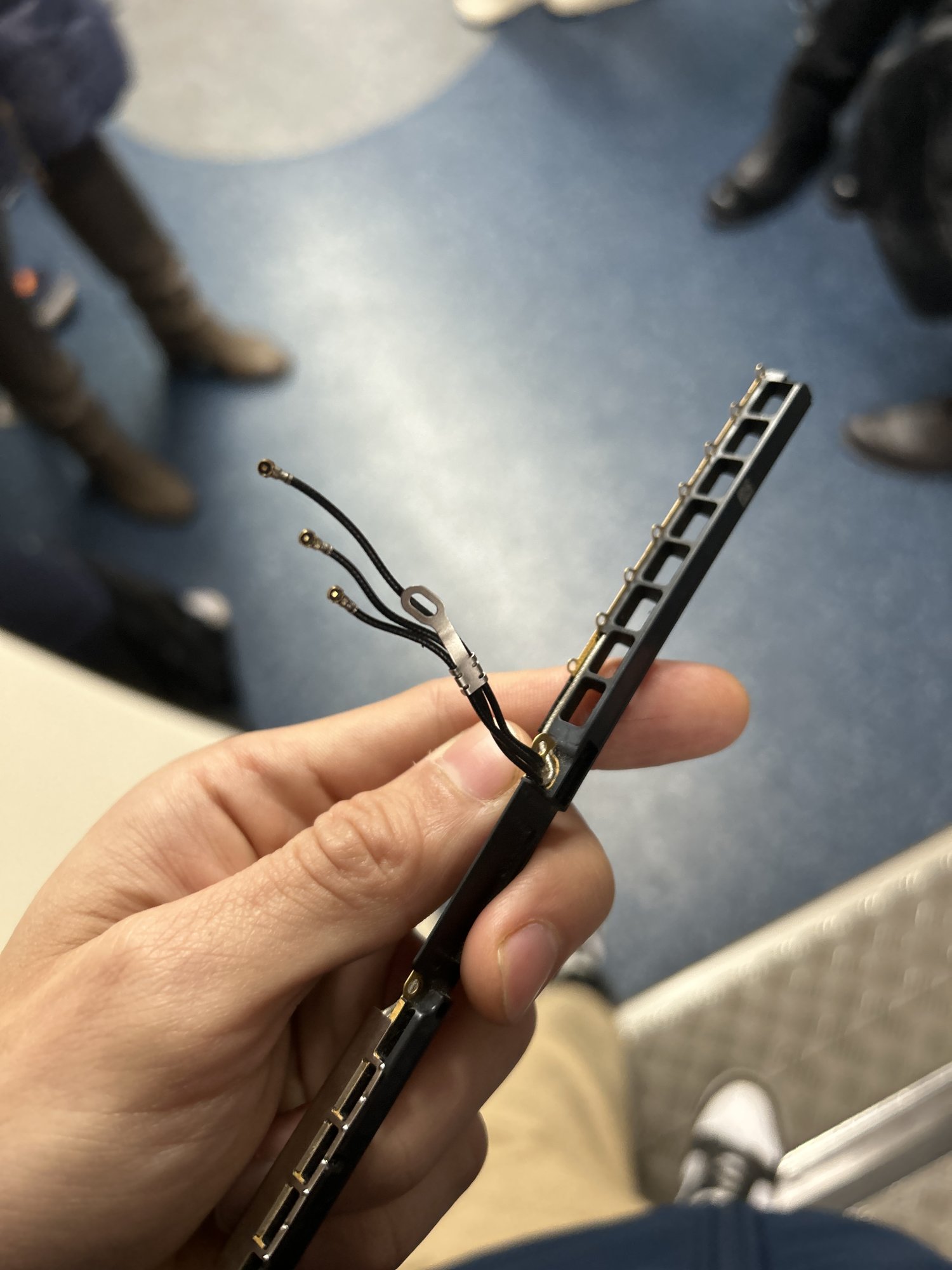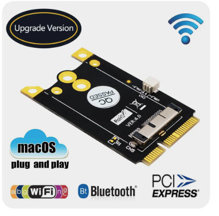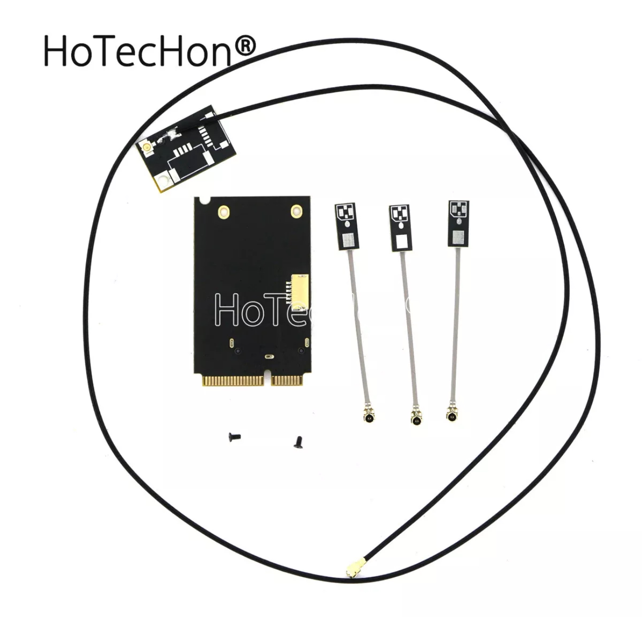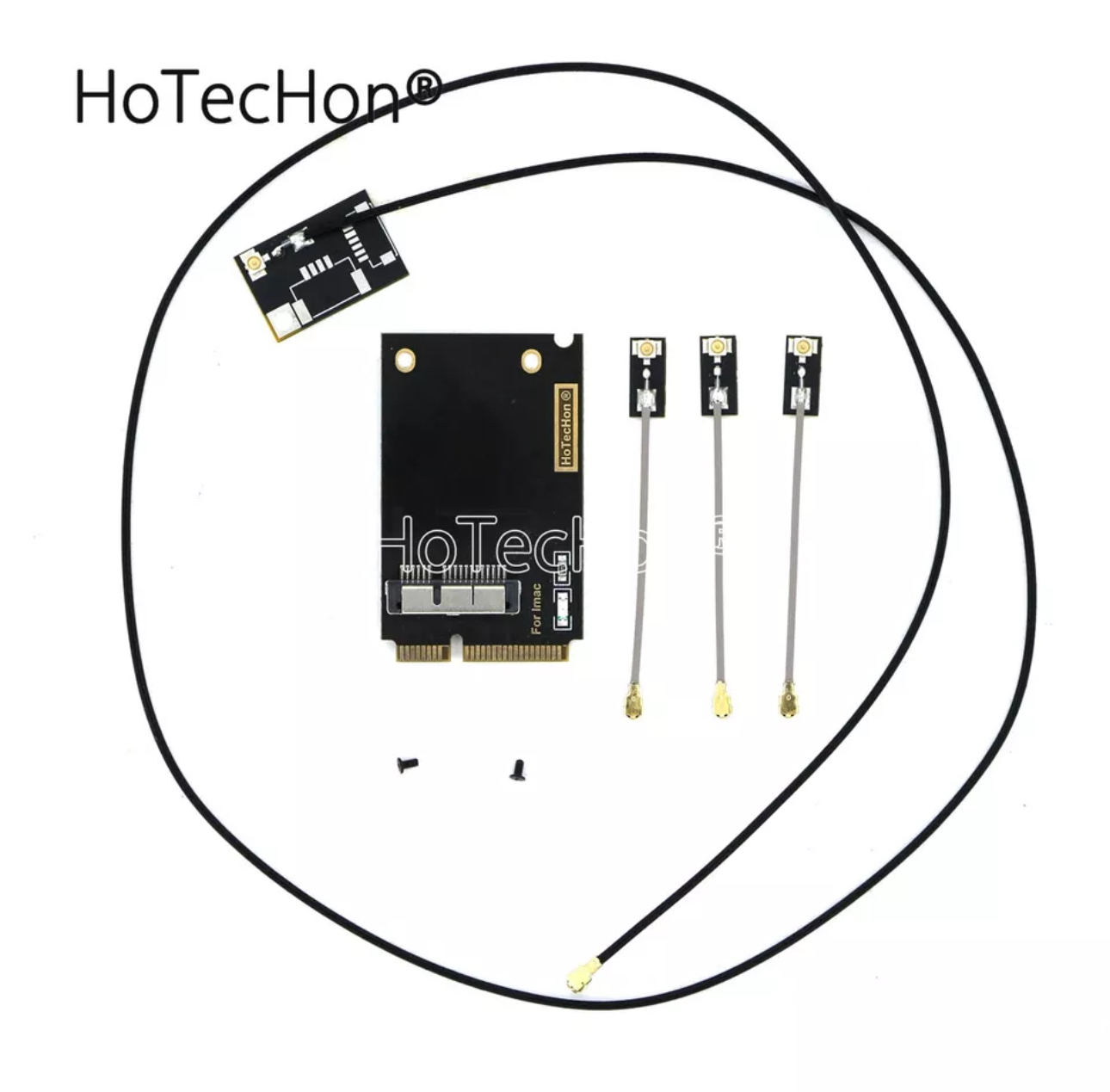 I plugged the WiFi cables into the new WiFi card, then the BT extension cable. Then I screwed the WiFi card to the adapter. This also prevents the cables from coming loose. Then screw on the adapter in place of the old WiFi card. Fits perfectly. I removed the old Bluetooth module and pulled the cable back to the new WiFi card. Simply plug it into the connector there. Now plug the BT extension cable into the BT cable wich was onthe old BT module and you're done