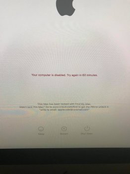 "I have a 2011 iMac that was of course working just fine. I got an alert it had been locked with my iCloud so powered up, and on the screen it says disabled try again in 60 minutes and has a fake email at the bottom to email if I can't get the iCloud unlock password. According to Apple, my iMac is not in fact locked by iCloud so I can only assume this is a fake screen especially since it's got a fake email at the bottom and no place for me to actually enter the password."