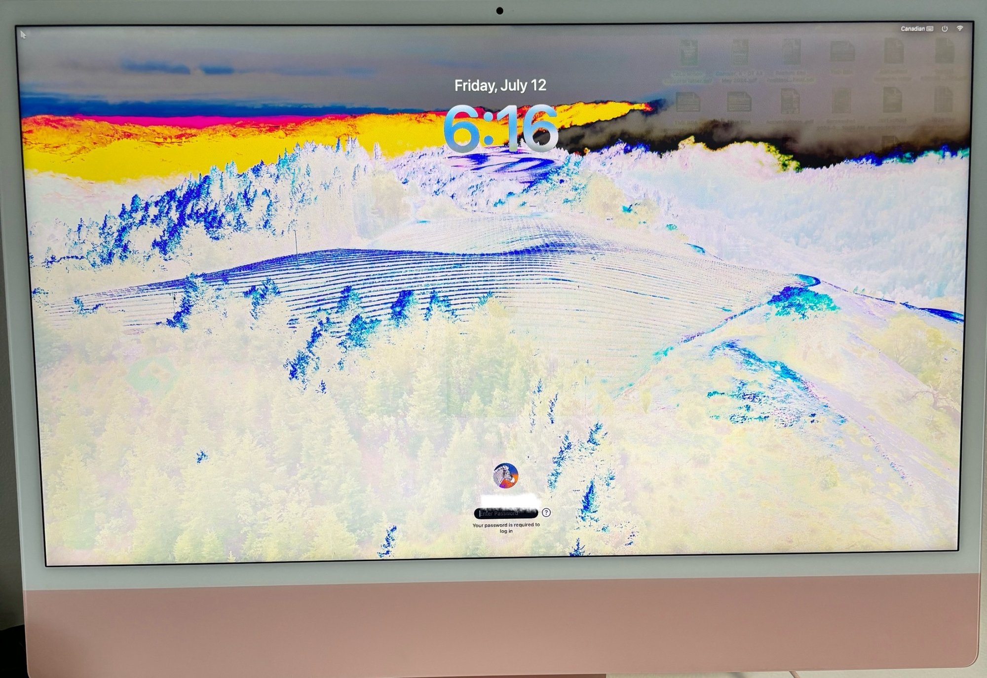 I was using my iMac, and then took about an hour break from work, and when I came back to it the screen was dark and the colours were all distorted. Almost like the colours were inverted, but not quite. I attached a photo. I tried restarting it, and shut it down for a bit and came back to it, but it looked the same. Except one time I restarted it it the screen was lighter and washed out (photo attached).