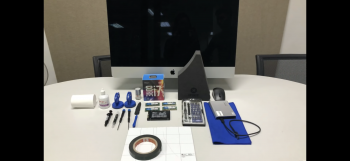 1. I used a long strip of painters tape, sticky side up, folded at each end to the table, to attach and spatially organize the screws during disassembly process. You can also label the tape with a pen by component, such as left speaker, hard drive assembly, power supply, cooler, logic board, wifi, and right speaker. This organization facilitates quick reassembly. Alternatively, you could use the magnetic project mat by ifixit, as seen in the first repair video below.