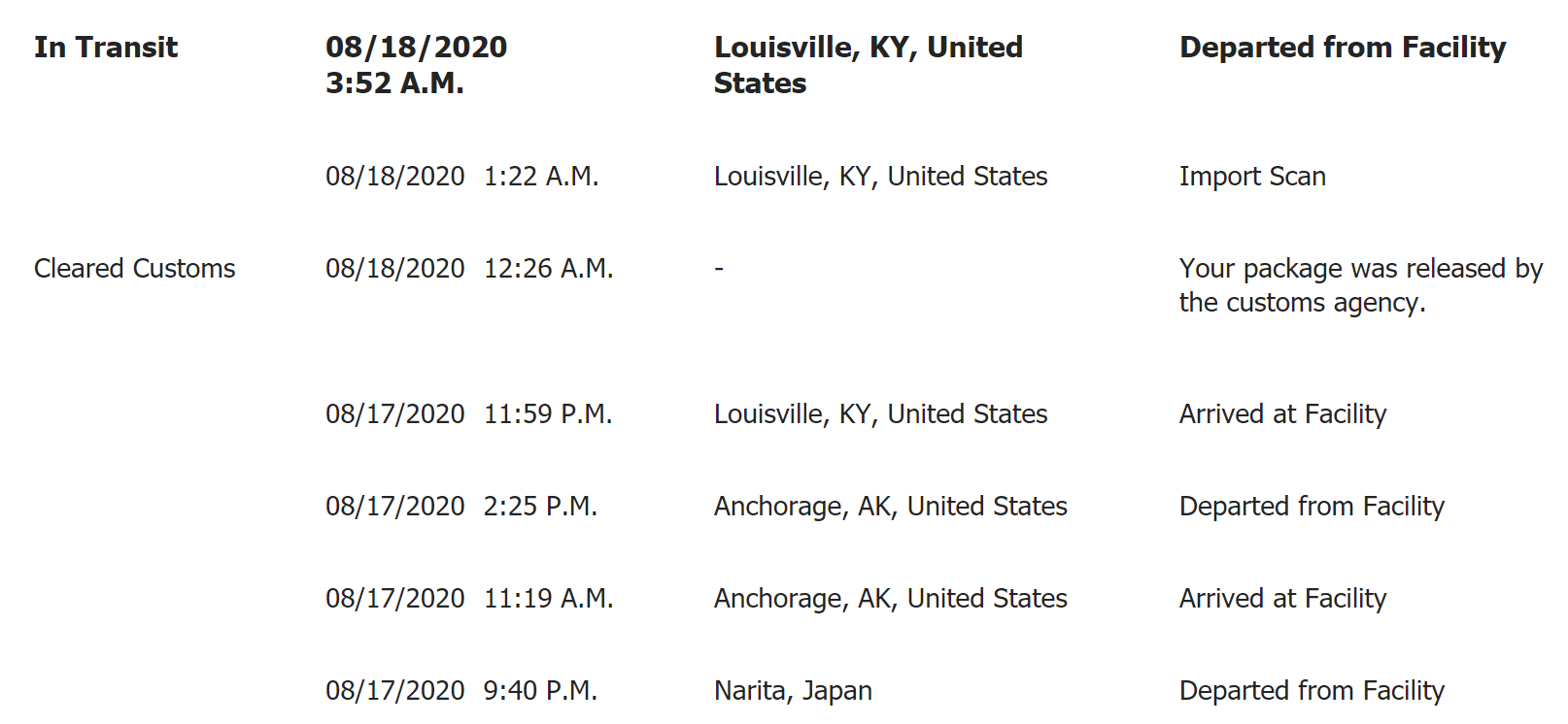 Did it end up being delivered today? Mine also arrived in Louisville this morning, but didn’t update to Departed from Facility like yours did. Tracking says expected delivery today before 9 on mine, also to California.After being stuck in Shanghai and Narita for 5 days, mine is now moving quickly and has been rescheduled for delivery to California later today(?). Having a hard time believing it, but we'll see.