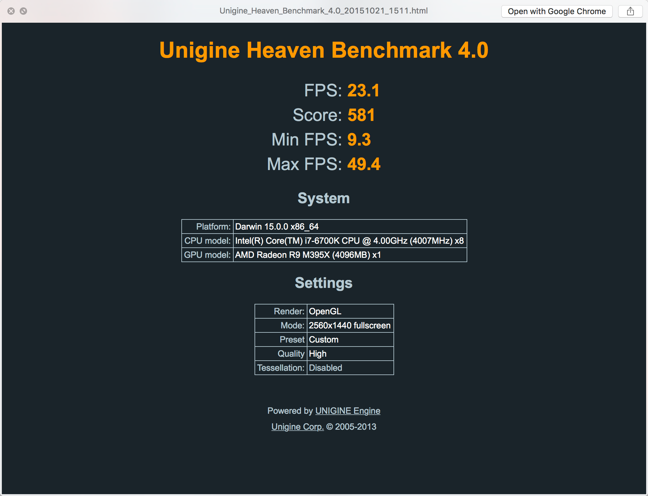 I'm not a big benchmark person, so can't help too much there, but I did run Unigine Heaven on the new machine and at any quality setting (medium, high or ultra), the fan speed remained the same at 1,200rpm, although GPU temp reported by Unigine did go up as high as 98 degrees, but still no audible fan noise (I turned speakers off so I could listen out for that).