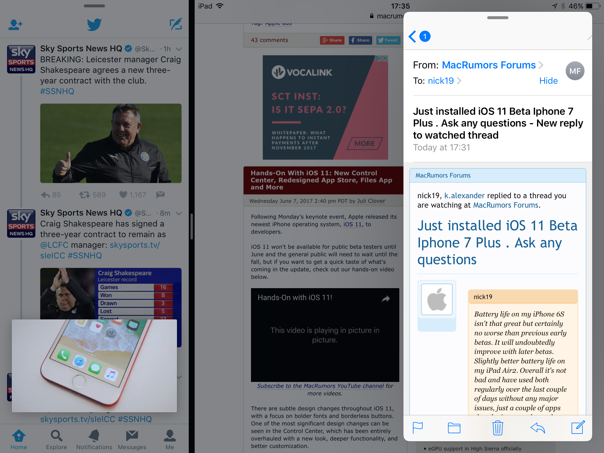 Twitter, Safari, Mail and PIP video. Note Twitter and Safari and inactive when Mail swiped over.