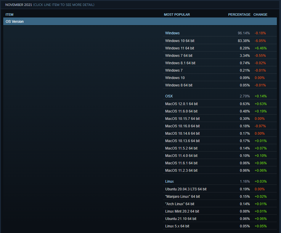 Been trying to do up some comparison graphs using October's Steam stats, but I'm struggling a bit with the layout.Too bad they don't show YoY so you can see the progression or regression. Surprised Linux is that low but should jump when Steam Deck ships.