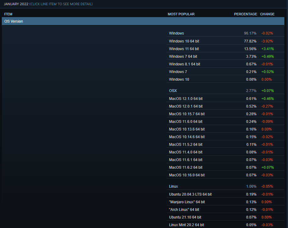 What is really depressing about these stats? There are more people using Windows 7 than there are using macOS and Linux combined.+0.07% increase from last. Going to screen shot for historical reference. Will be interesting to see if Linux surpasses with Steam Deck release. Linux is already up 0.03% from developer Steam Deck units which is probably like single digit % vs consumer units.