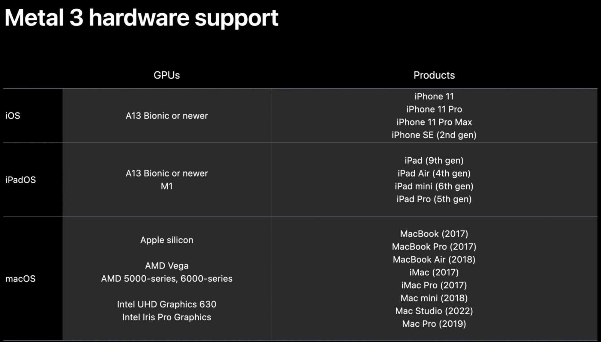 In regards to Metal 3, what's often overlooked is feature availability. For example, mesh shaders are currently only supported on 4% of Vulkan devices, which are limited to some Nvidia models. But Metal 3 brings mesh shaders to all Macs sold in the last 4-5 years or so. That's a huge thing.