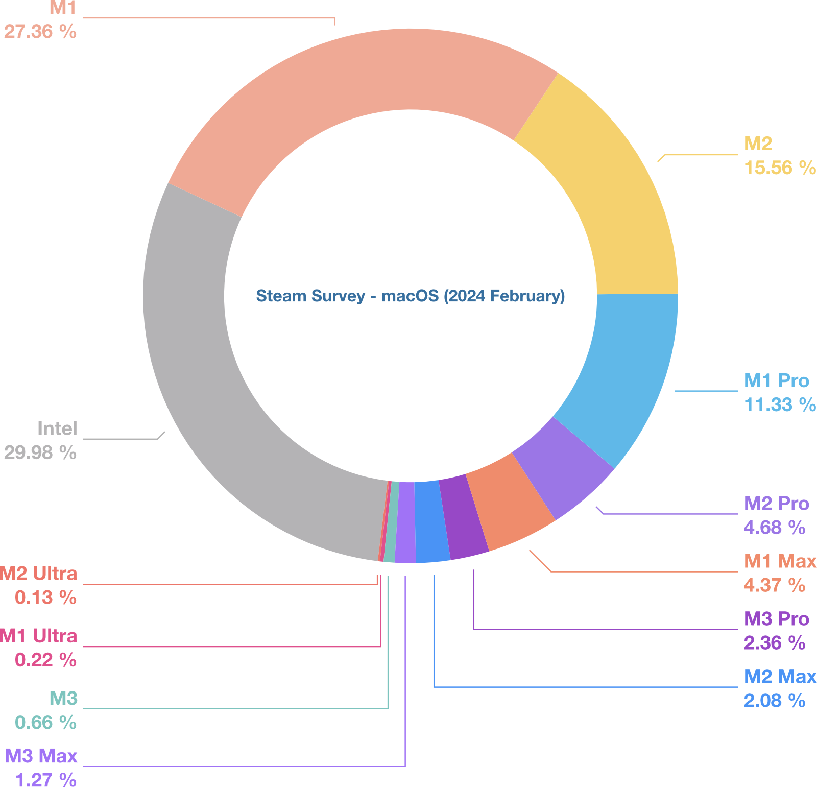 2024 February Steam Survey puts Apple Silicon at 70.02% (-0.15%) market share on macOS.