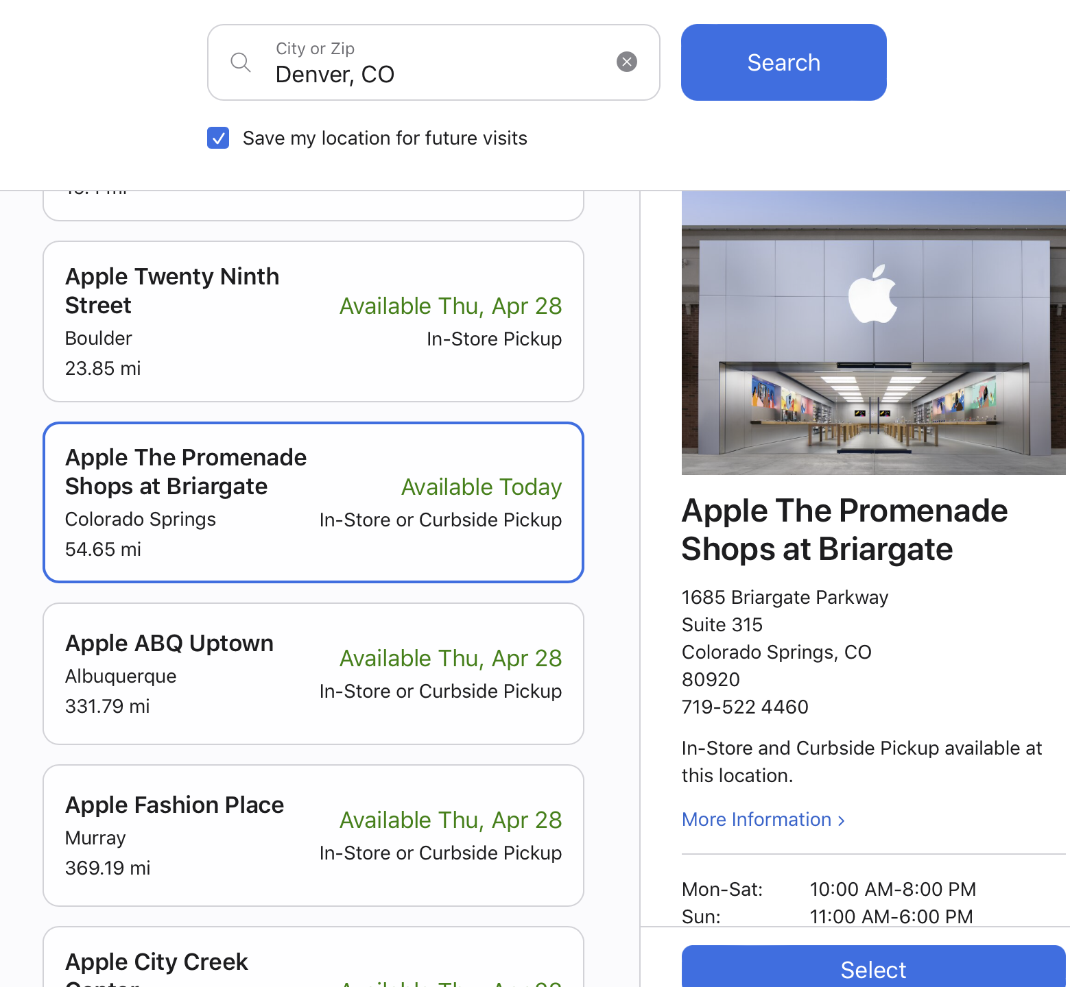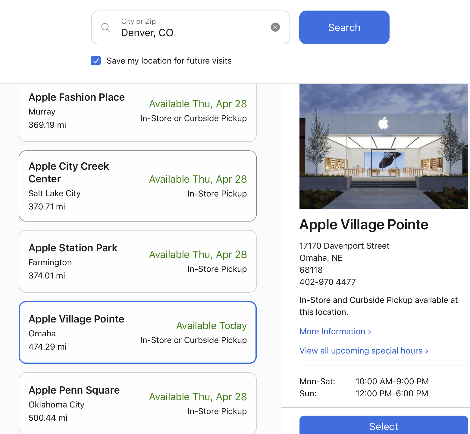 Then Apple's website is wrong. 474 miles away from Denver cannot, by any reasonable metric, be considered a part of the Denver Metro area. The same goes for Colorado Spring. While it is significantly closer than Omaha it is not part of the Denver metro area either.Apple's website regards both as part of the Denver area. Look at the search box at the top of the screen captures.
