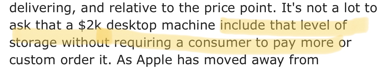 In another post, you say that your current computer is a 2014 Mac mini with 256GB of storage. I can see why you want more, but maybe be less assertive about telling other people that they need 1TB. Because I use my computer strictly as a workspace, I buy 512GB computers and typically have over 450GB of free space on my internal drive. That is plenty for my needs. This time, I'm considering a 2TB Mac Studio, but for specific, atypical reasons that I certainly wouldn't extrapolate to the needs of other people.