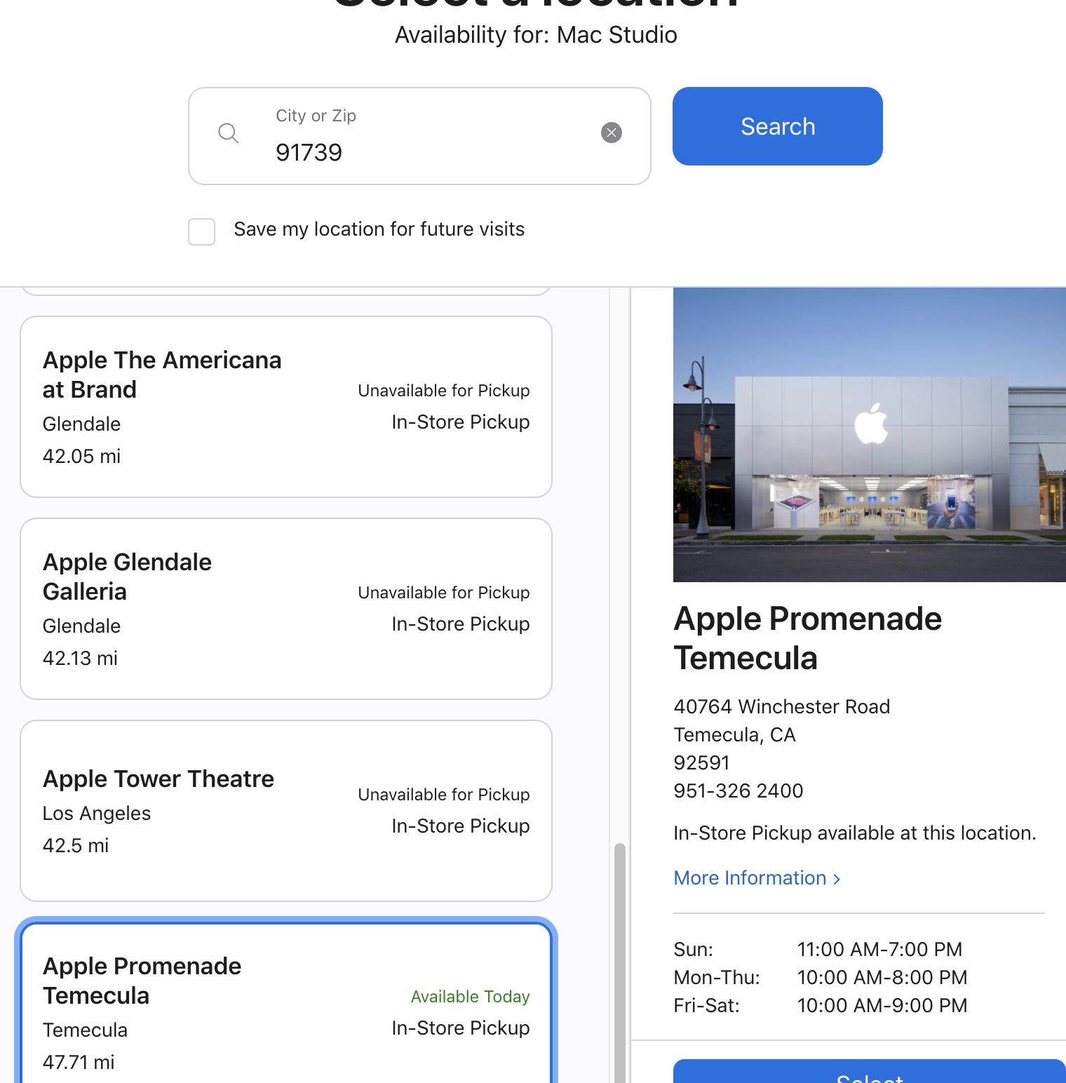 Won't be for long. I am surprised the low availably of these Mac's. They are pretty amazing.Base Max Mac Studio available today at Temecula, CA Apple store: