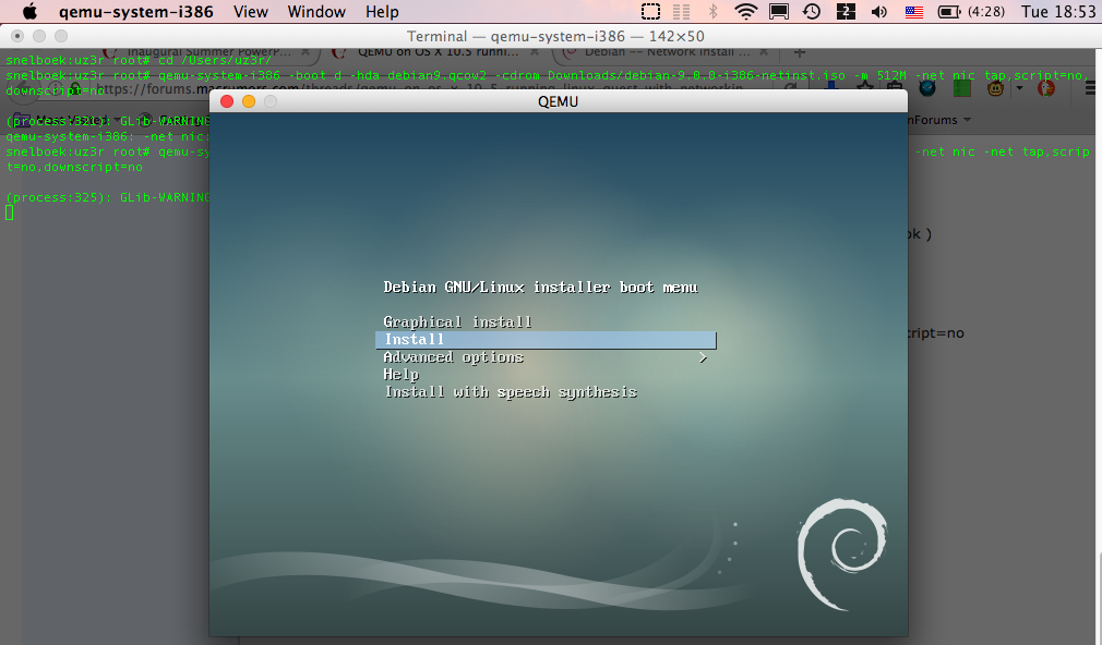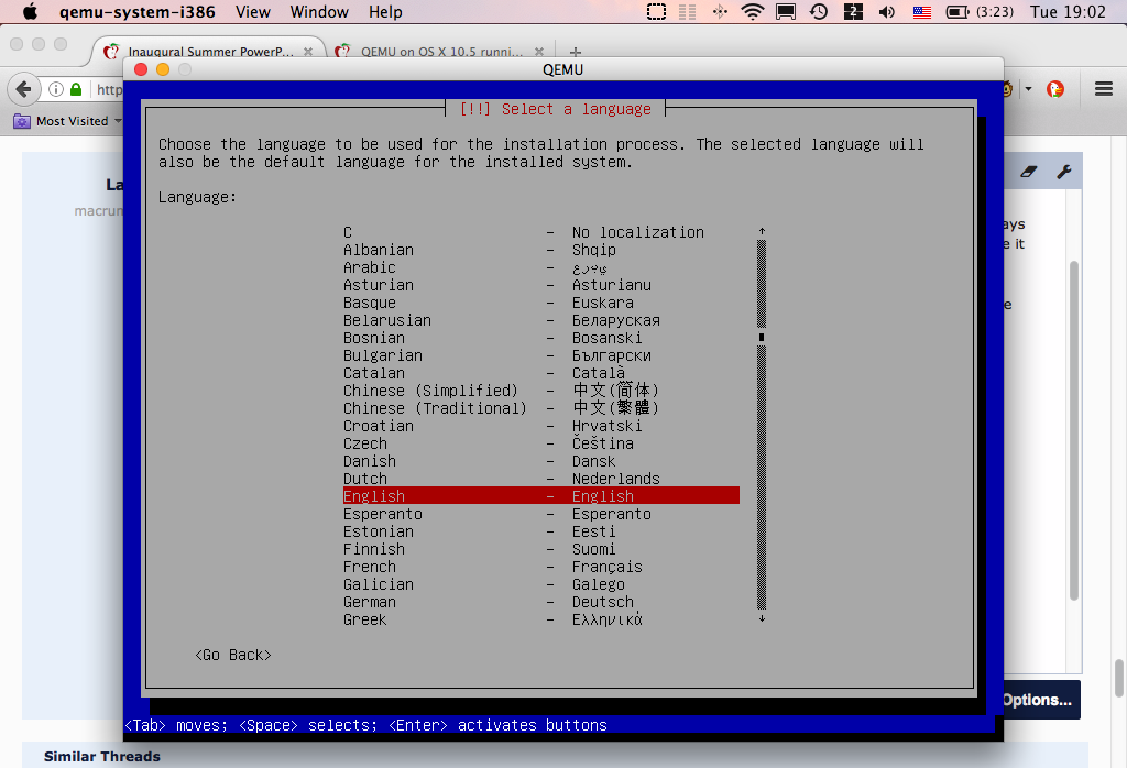 and is currently installing but I'm on a PB 12" G4 with Bettery Battery life, 2 tabs in TFF , TextEdit opened, Terminal 2 windows and qemu-system-i386 running so it might take a bit to finish