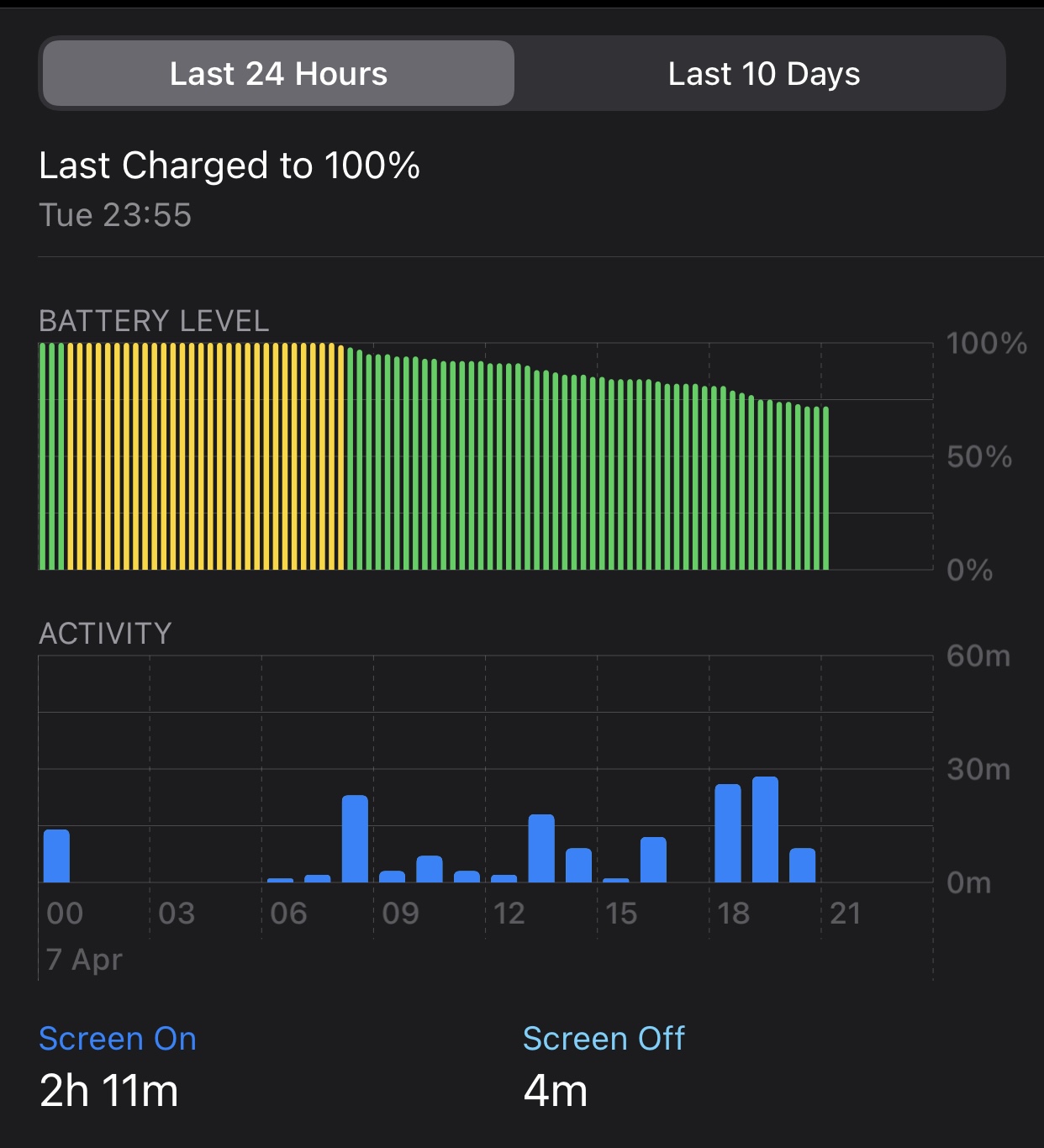 Screen On shows 2h and 11 minutes. But if I count all the bars individually, it adds up to 2h and 38 minutes. I’m on my 11 Pro Max here. Could this be a bug that 14.5 is aiming to fix?