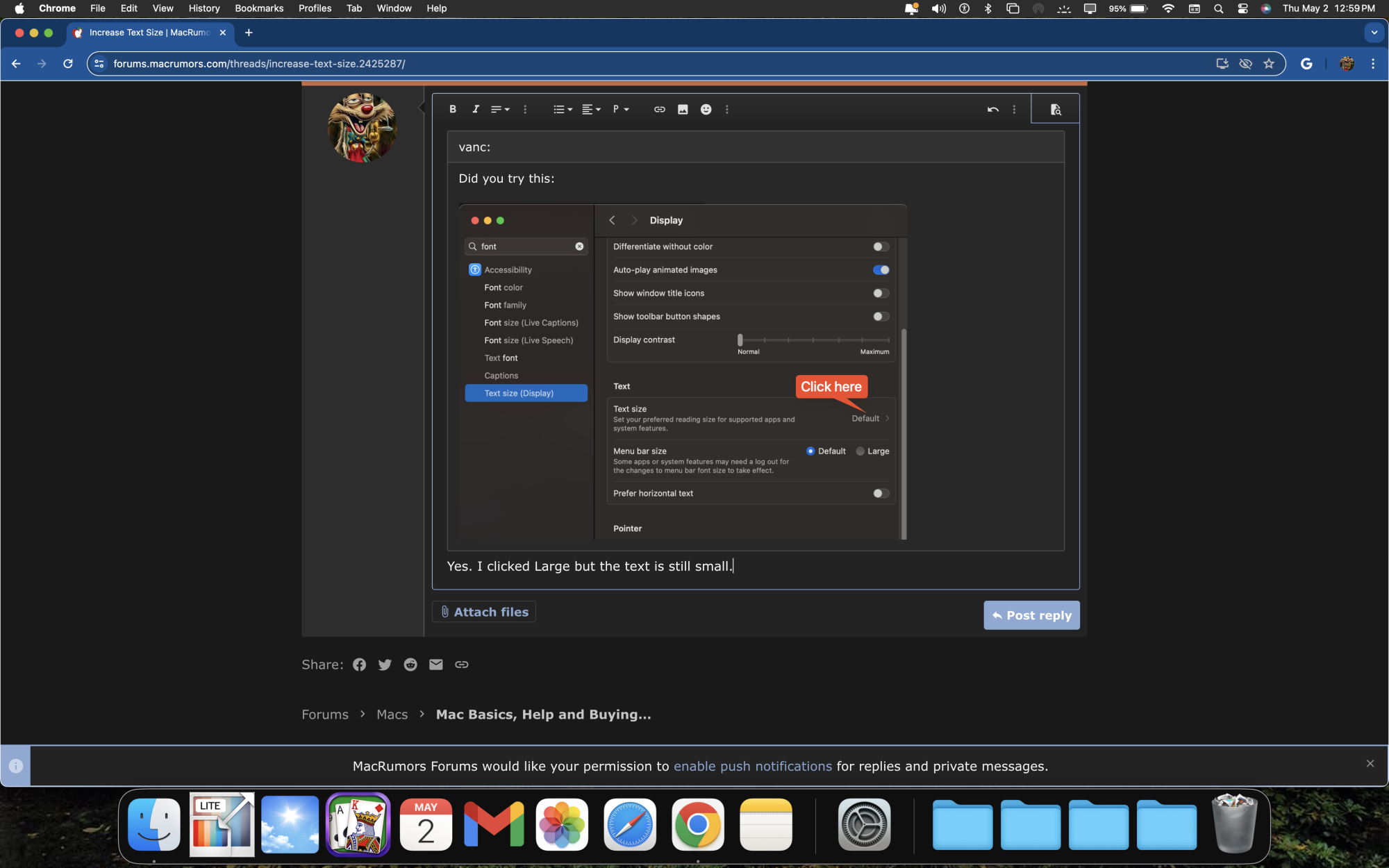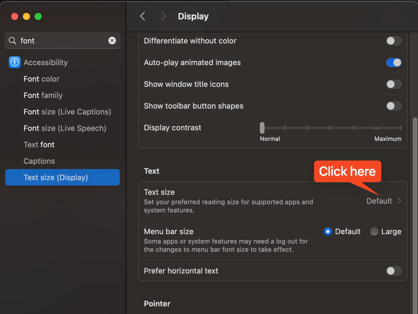 Individual apps might have their own settings for display size. Especially relevant for browser apps. In Firefox, I can set a zoom factor for graphical items and another zoom factor for all text on a page, and also set a preferred default. I have all my pages open in 130% zoom, makes most web sites fill the screen. Browsers have plus or minus buttons or usually react to cmnd-plus or cmnd-minus.