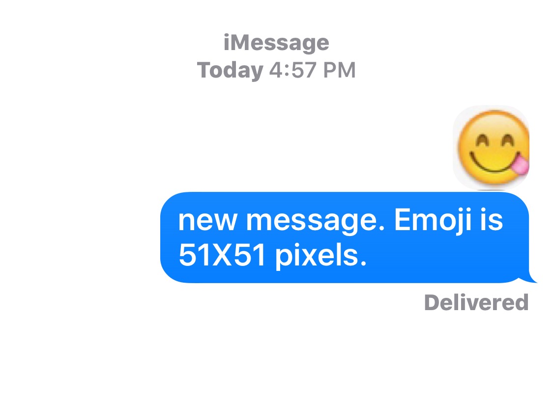 Was wondering if anyone knew a way to include a graphic inline in iMessage? I'd like to send some custom emoji, and failing access to unicode, I thought I'd try simply attaching a photo version. I have the graphic file created, but each time I attach it from photos, it makes the emoji huge, in spite of the fact that its designated size is 4mmx4mm @ 326ppi. Does iMessage ignore these and make every photo the same size no matter what?