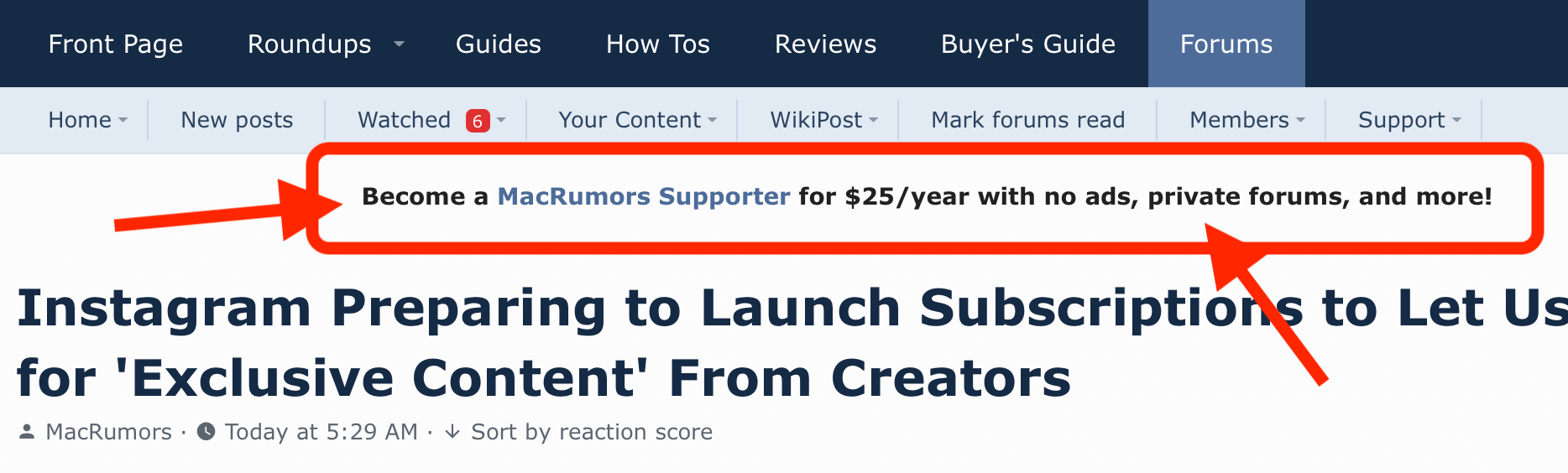This one ^^^ I highly recommend (and it turns out that option has been here for a long time, just not well, uh, advertised). $25/yr to support MacRumors, where they get 100% of it (well, probably 97%) rather than them getting some smaller fraction of that from ad impressions, plus, no ad JavaScript spinning up my CPU and fans, was totally worth it, and my only regret is having waited so long to subscribe.One more example of this move to pay content creators directly (vs. ads) at the top of this page, actually.