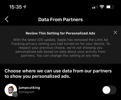 Apparently, Instagram has changed their privacy settings and alerted me to a message stating “With the latest iOS update, Apple has removed the limit as tracking privacy setting you had turned on for your device.”