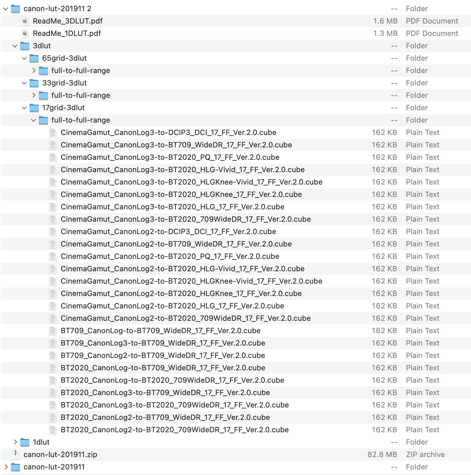 The Canon files consist of 2 folders (3dlut & 1dult). Within each of these folders there's more folders and finally several .cube files.