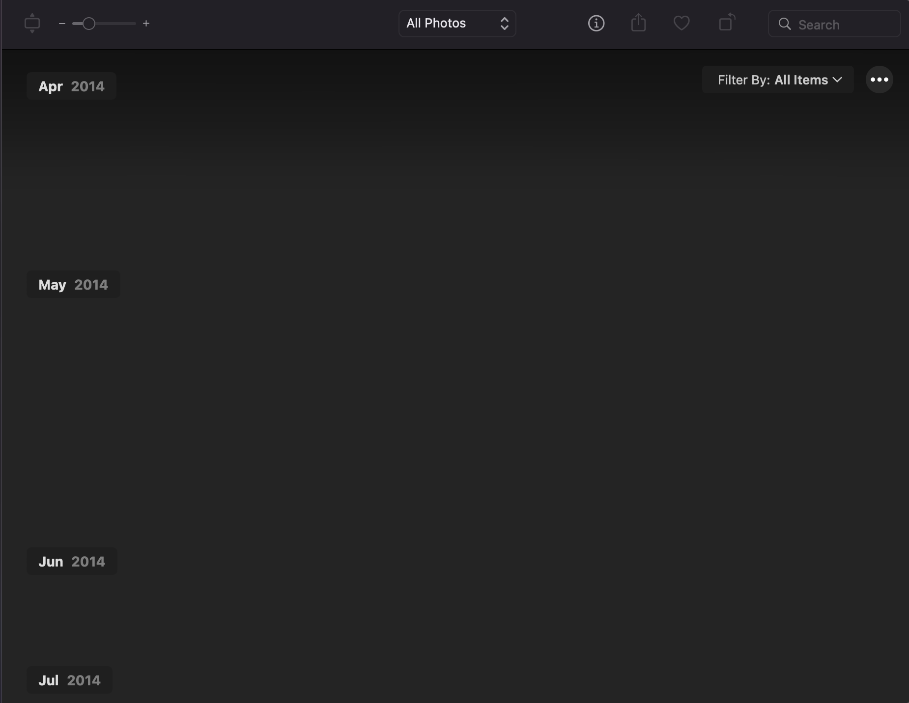 The only weird thing is that I can't fully zoom out to view all my photos, see attached, below. At that zoom level, my pictures don't appear at all, my screen just looks greyed out, any ideas?