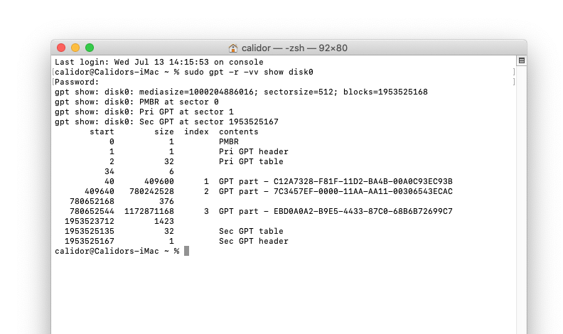 sudo gpt -r -vv show disk0- This will show you the partitions in disk0, notice how it uses a protected MBR (PMBR) at sector 0.