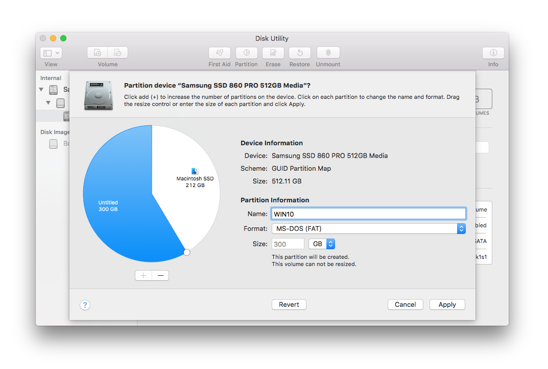 - Note: you may get a final partition name of "10" instead of "win10", this is a known bug of Disk Utility, ignore it, the name won't matter.