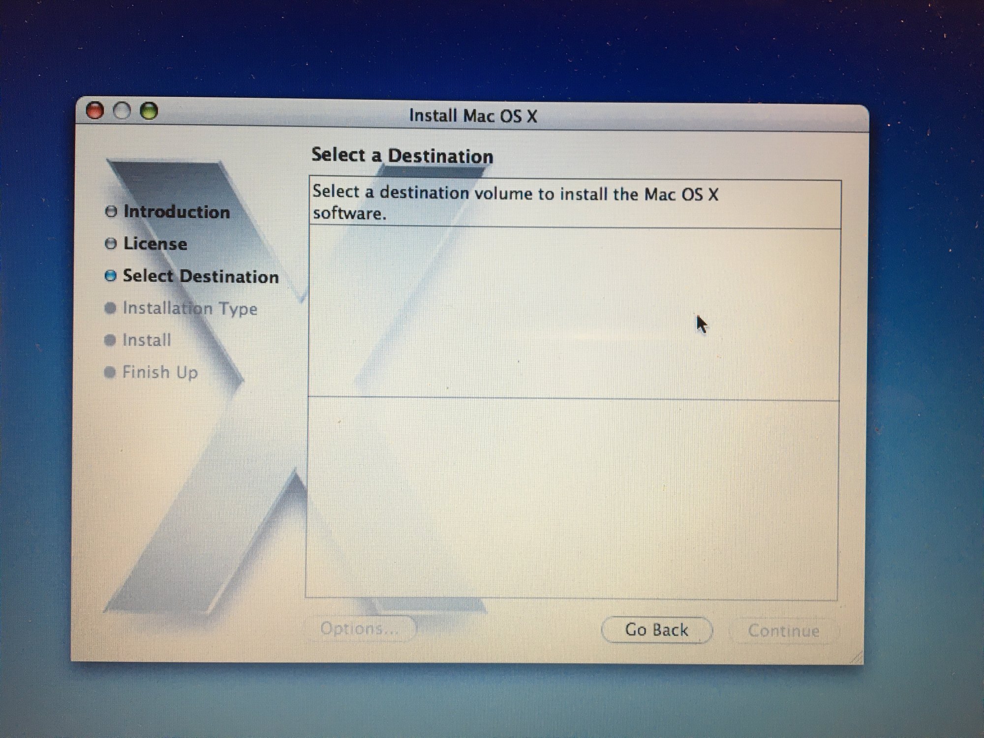 The hard drive is blank, and the machine will boot into the installer from the disc. However, on the third screen, where the installer asks the user to select a disc on which to install the OS, no options are given, ie the installer is not finding my hard drive.
