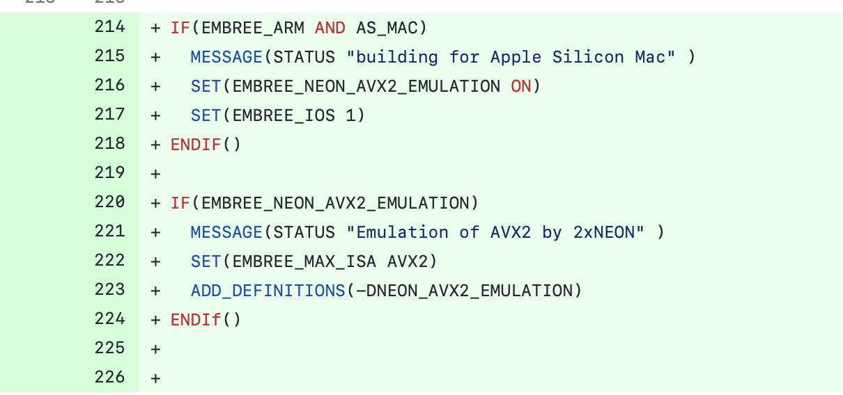 Below is from the patch that implements Apple silicon support. This is only a CMake config and not the implementation, so that it is readable enough for ones without programming background. When building for arm64 on Mac, Embree emulates avx2 on top of neon instead of implementing a native neon code path.