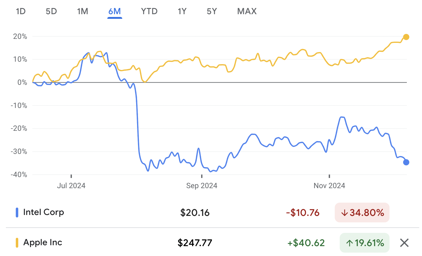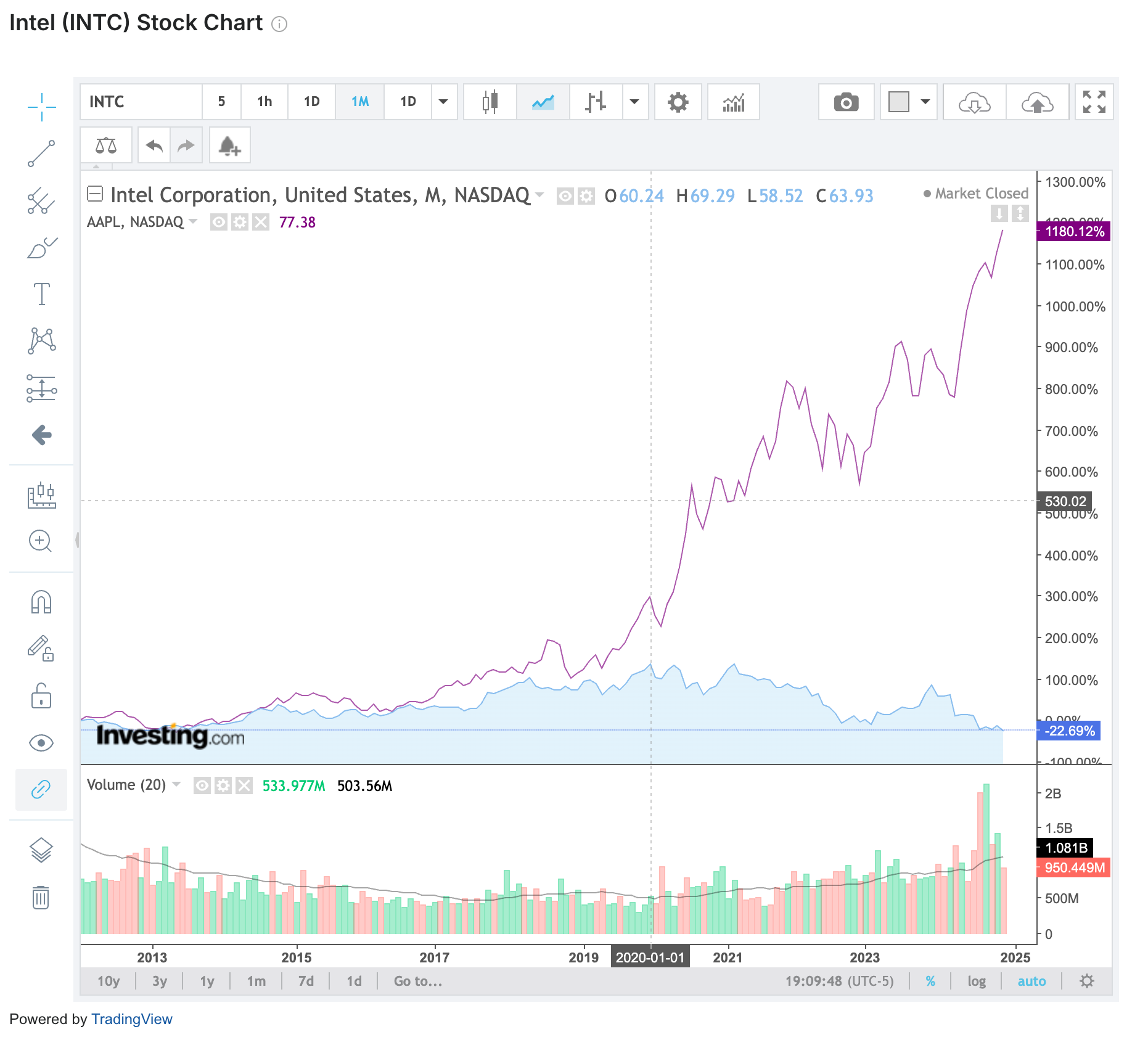 What I'm having issues with is understanding why you are so fixated on trying to prove that Apple Silicon's release in 2020 is not the cause of any divergence between INTC and AAPL? It's not like my post was some thesis on stock market efficiency, despite your ignorance on the forward-looking nature of markets. In fact, I wrote in my