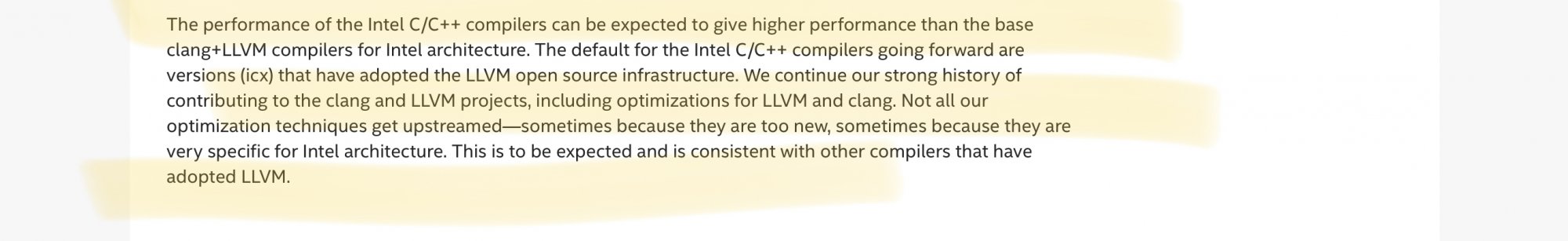 I’ve attached and highlighted interesting commentary from Intel themselves on this very matter (as well as screencaps of benchmark differences that Intel advertises as it relates to ICC on Spec tests in comparison with open source CLang-LLVM generated binaries (again here, it’s hard to compare because of default behavior of ICC and open source projects
