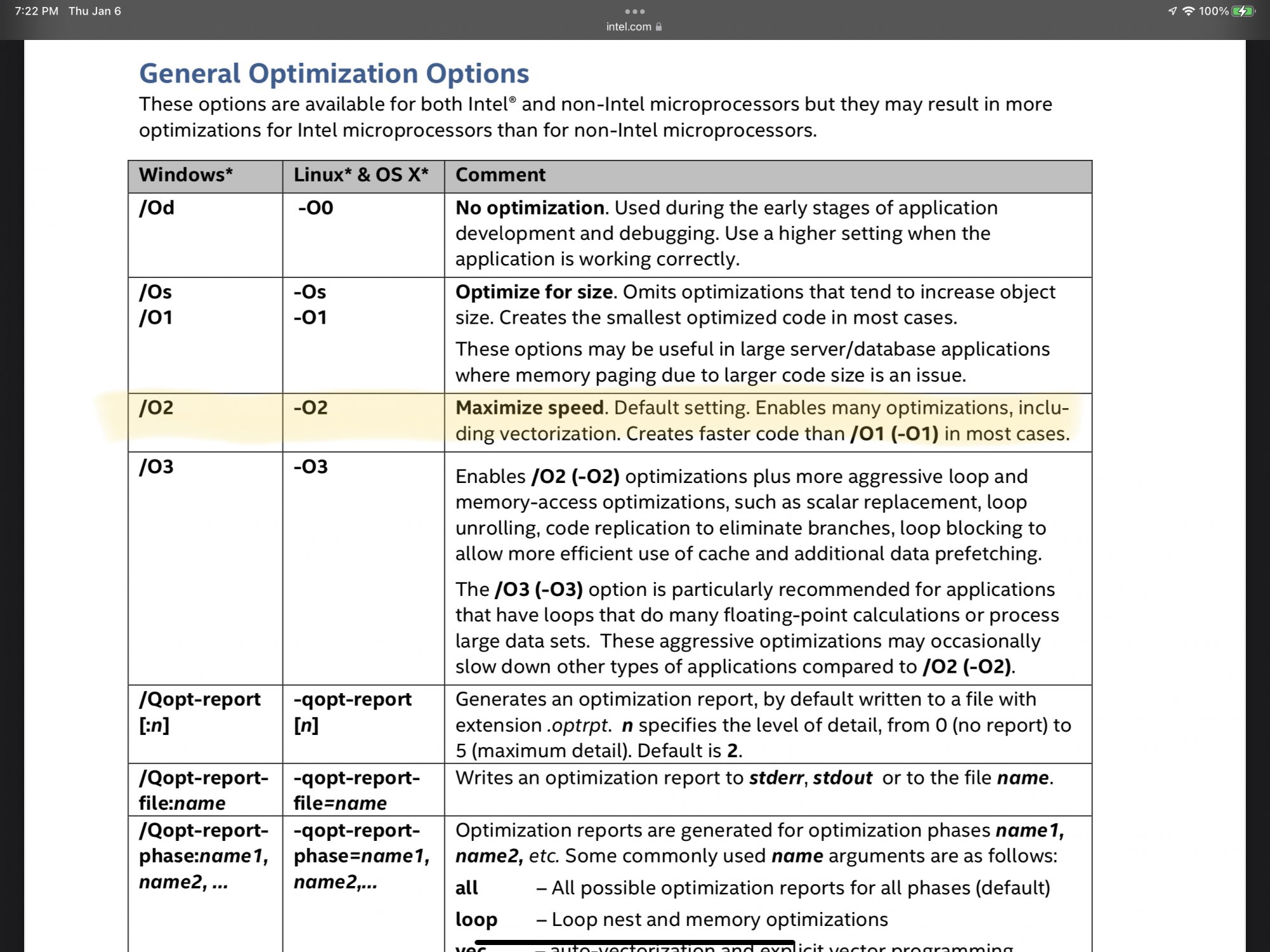(see again the attached documentation screenshots for your interest on ICC and default optimization levels) - default is -O2 or FAST.
