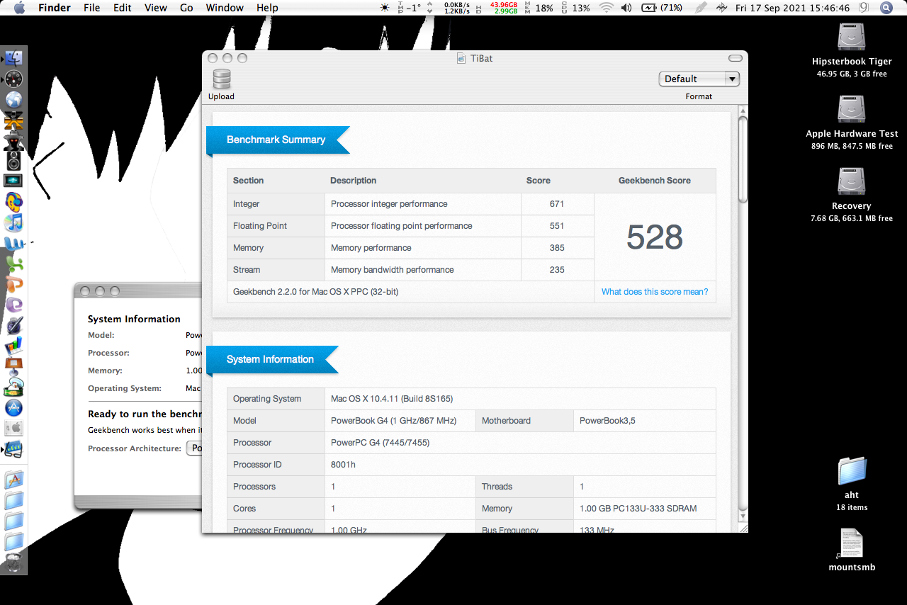 Earlier today and yesterday I posted a picture in the What have you done with a PowerPC today? thread showing a 1 GHz Titanium PowerBook G4 next to a 1 GHz Aluminium PowerBook G4 and some Geekbench 2 scores. I and some others had pointed out that the Titanium score was rather suspect and not quite in line with what the average score for this machine actually is-- according to EveryMac, this should be about 556, near the 542 that the Aluminium got.