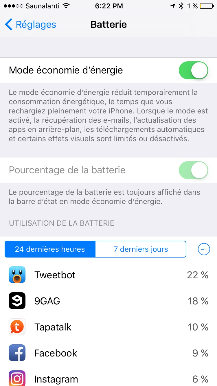 Battery life is really amazing. iPhone 6. Low power mode ON at 20%.