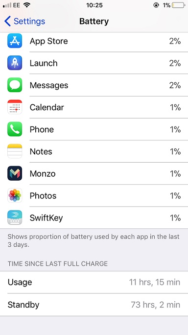As you see I got 11 hrs, 15 min Usage and 73 hrs, 2 min Standby at 1% left. Low Power Mode has been off until it hit 20%, then on, and have not done any audio/video streaming and no games.