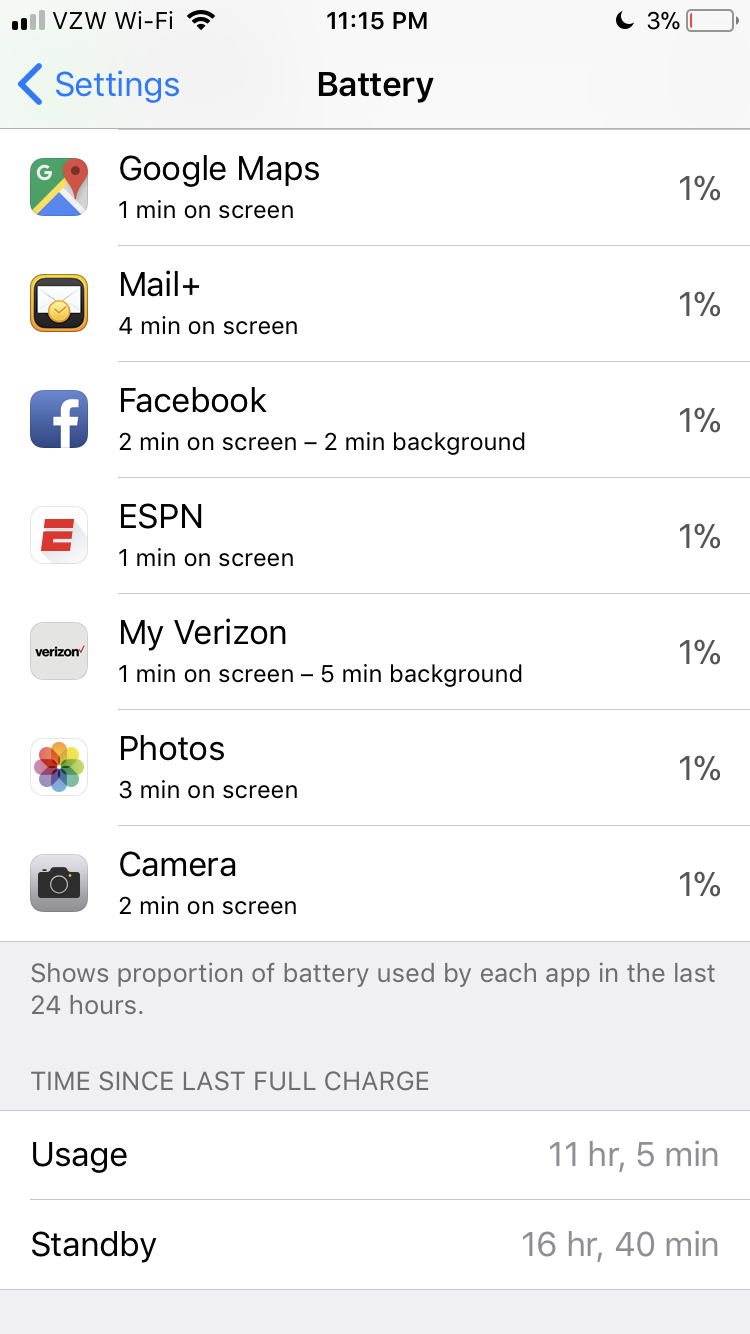 How much of that would be on screen time?Well, as a similar anecdotal example, here's my regular 7 (with iOS 11.1.2) from a few days ago with the same 3% remaining: