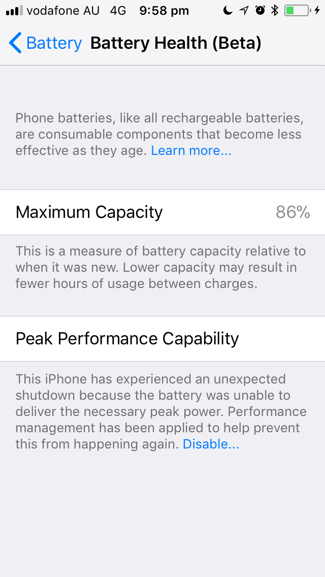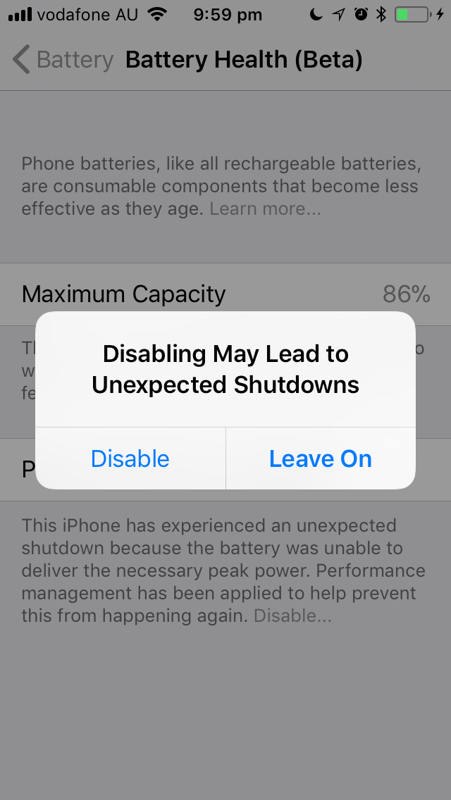 What I find interesting (sad) is that your health is reporting 86% and it had this condition. Of course this feature is in beta ON a beta iOS so I would expect more changes to come. I let my iP6s drain the other day and it got to 1% for a bit then it shut down. It did not trigger the power management. I am showing 87% health.Just had an unexpected shutdown on my almost two year old SE. Battery health was at 87% yesterday. Now at 86%. I was on around 3-5% battery (which isn’t *too* bad for a shutdown imo) when it shut down. I kind of just assumed that it was a normal low battery shutdown. That’s pretty much the level my phone would shut down on, even when it was still be throttled. So I’m not too concerned about disabling throttling. What do you guys think though? View attachment 750420 View attachment 750421