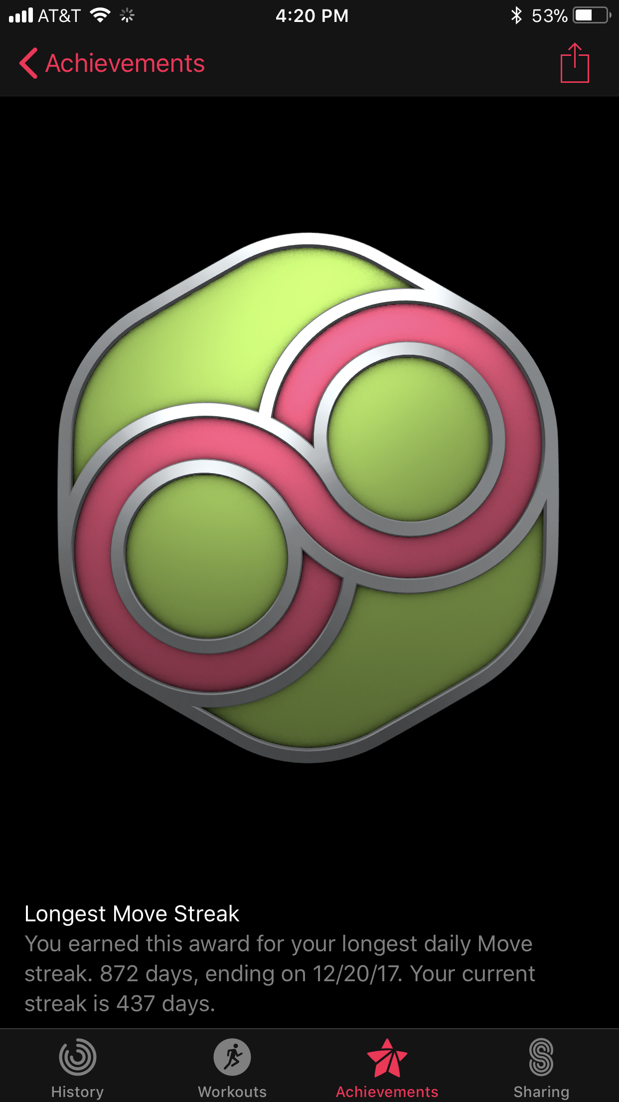 This morning I was at 437 days and my current streak was 437. Then it magically changed to 872 and says that I was awarded my 500 day move streak LAST December.